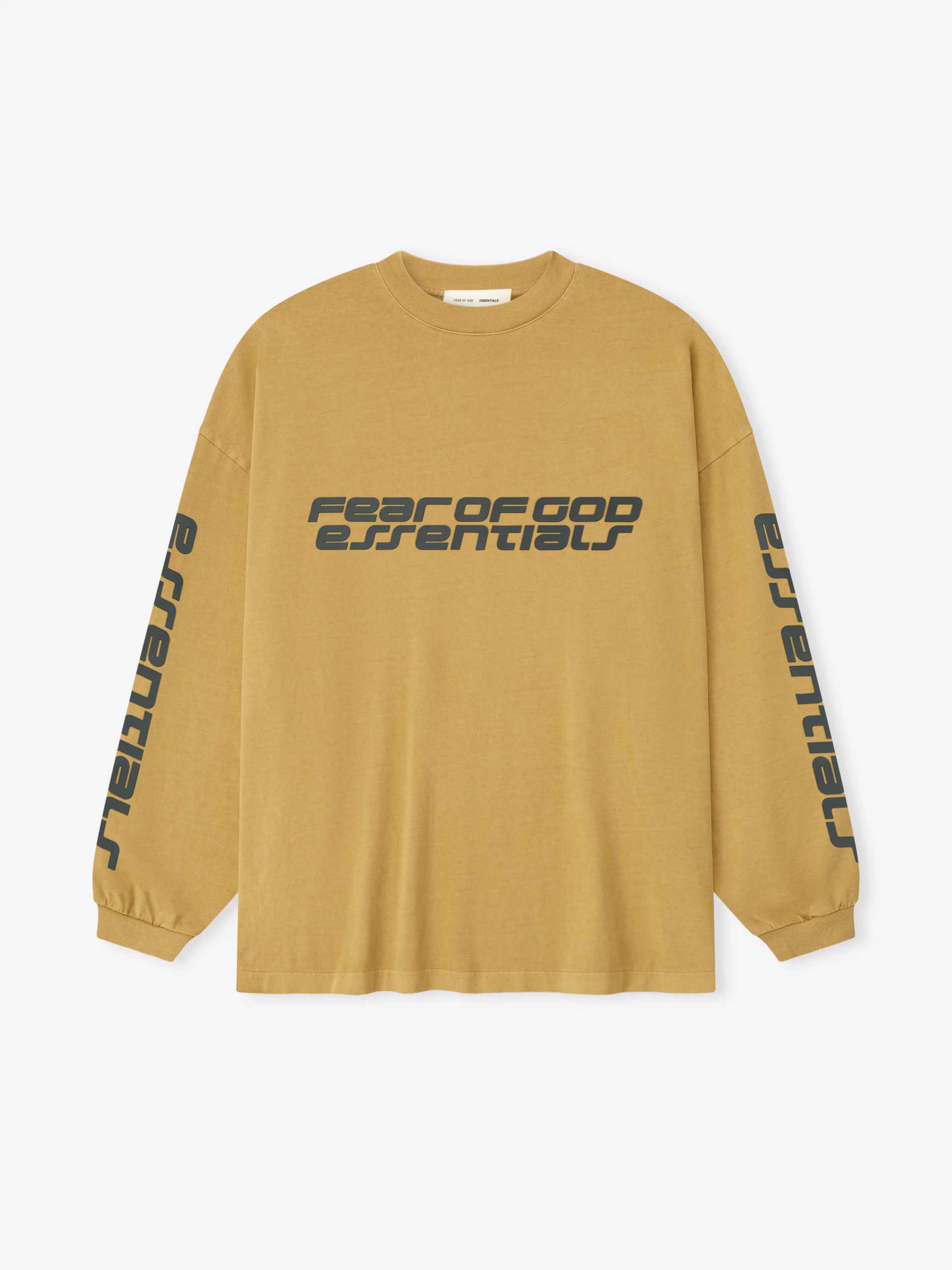 The 90s Long Sleeve Tee is made from 100% cotton jersey, offering a soft yet substantial hand feel. Designed in an oversized 90s-inspired silhouette, it features exaggerated proportions with dropped shoulders for a relaxed drape that tapers to rib-knit cuffs. The front is defined by a HD print application of the Fear of God Essentials lockup alongside the Essentials logos on the sleeves. The signature rubberized Fear of God Essentials label at the collar.