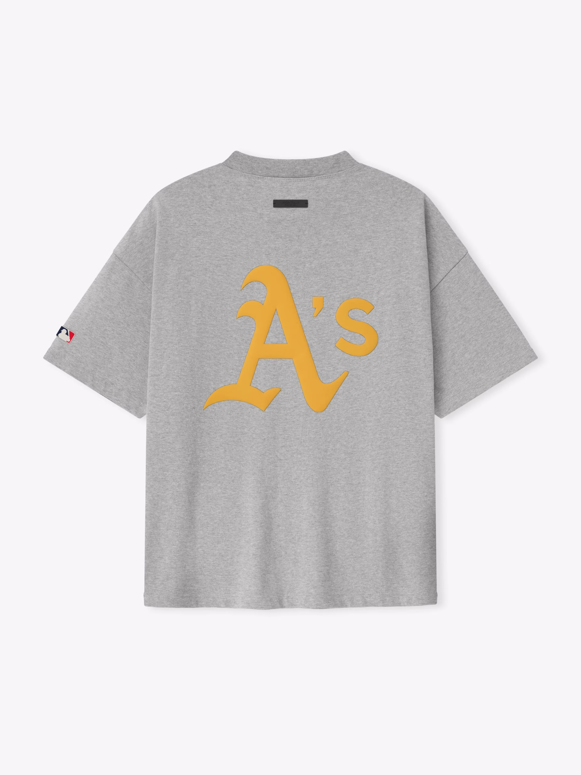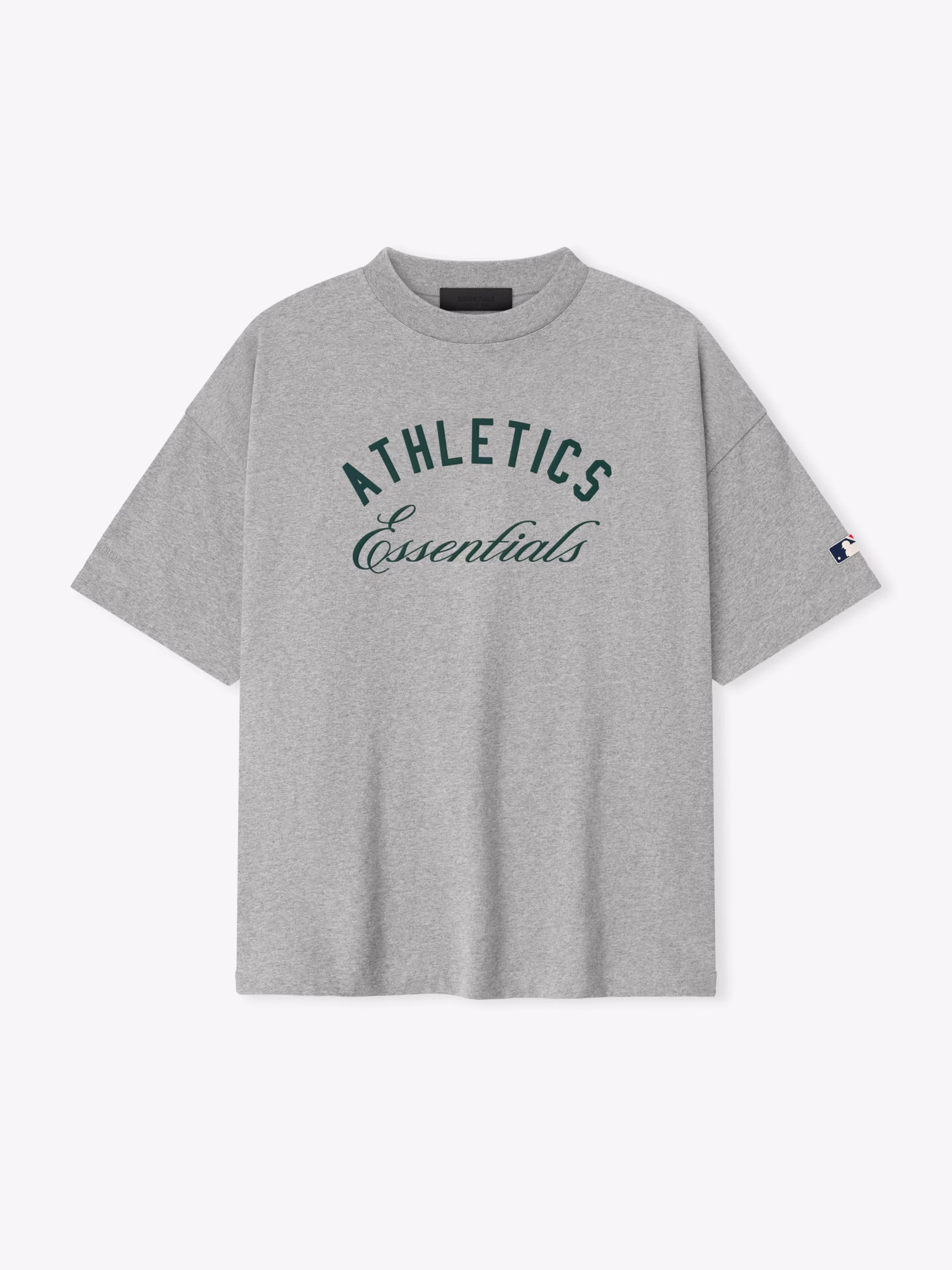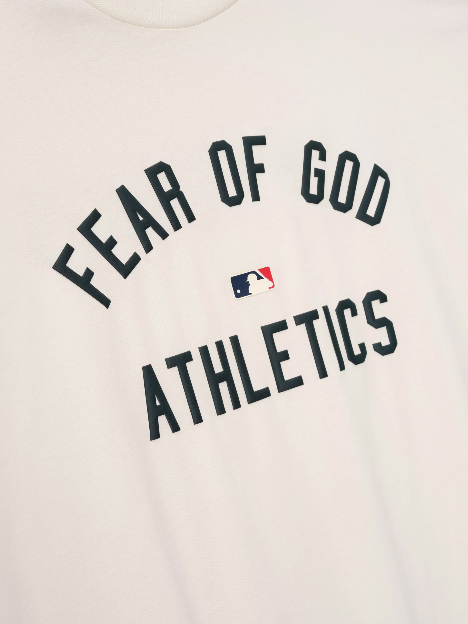 The Athletics 90s Tee is cut from 100% cotton jersey, offering a soft yet substantial hand feel. Designed in an oversized 90s-inspired silhouette, it features exaggerated proportions with dropped shoulders for a relaxed drape. The front is defined by a bold puffer-print application of the "Fear of God Athletics" lockup, alongside the MLB insignia. Across the back, an Athletics logo anchors the piece with the signature rubberized Fear of God Essentials label at the collar.