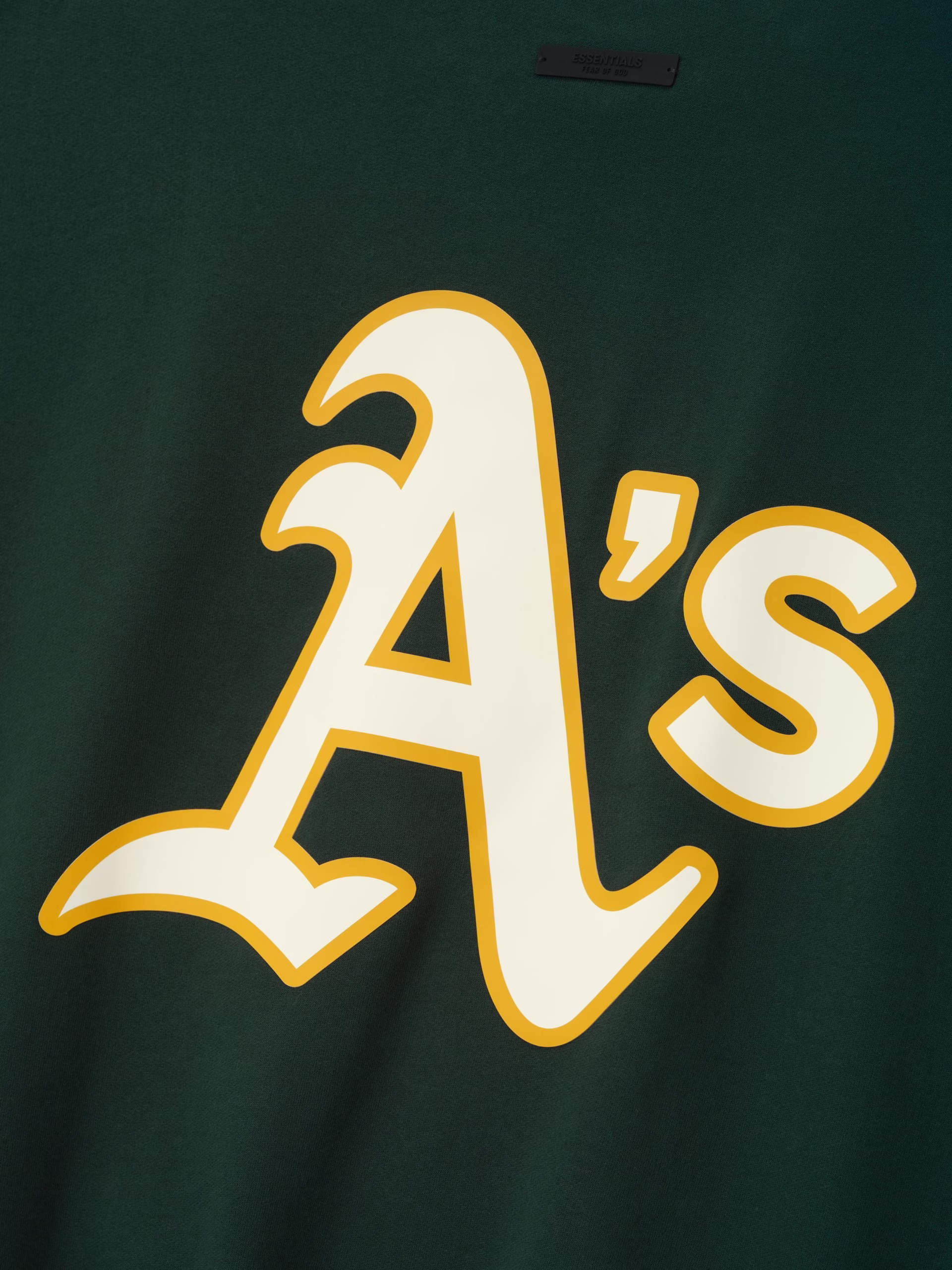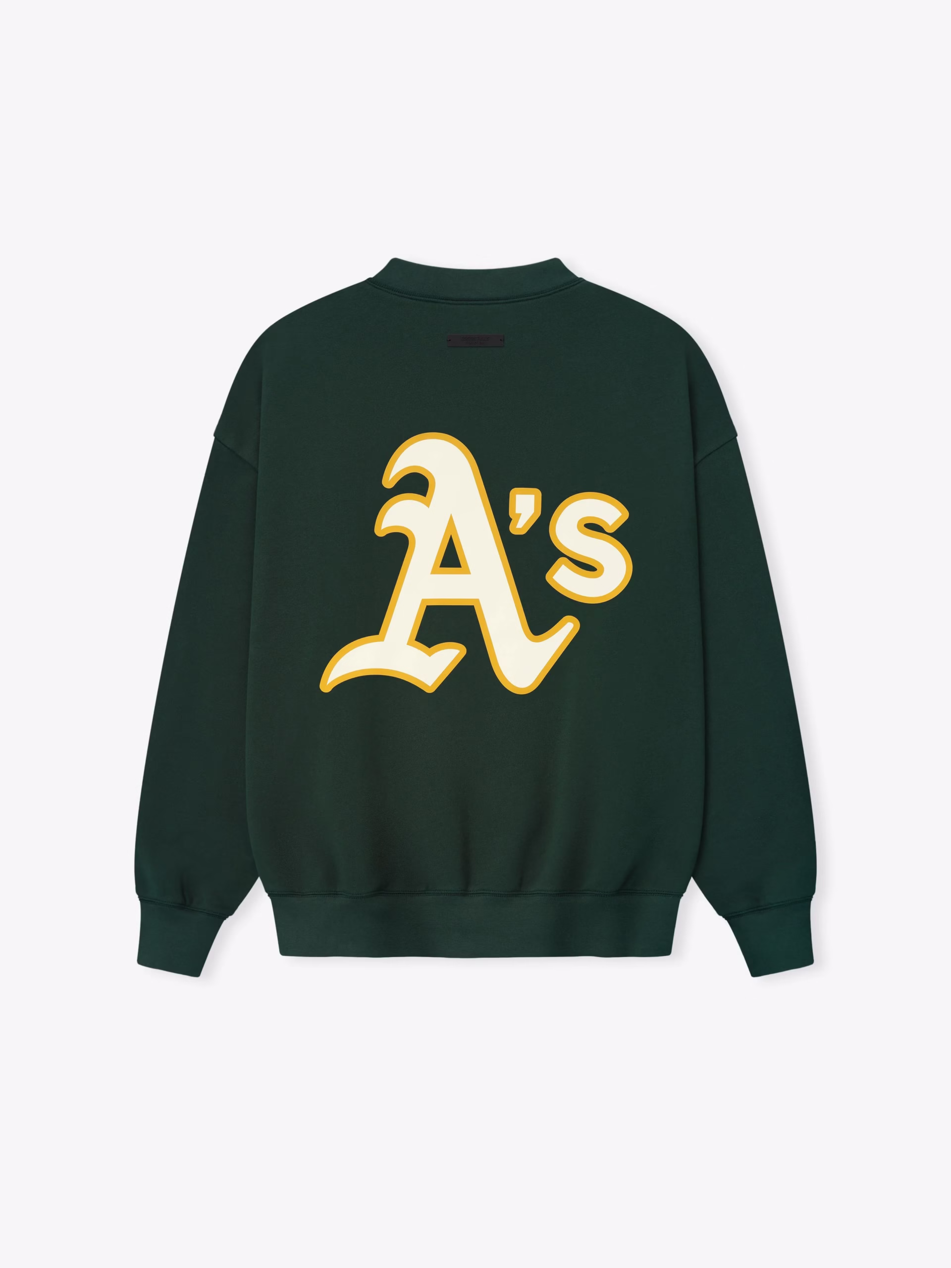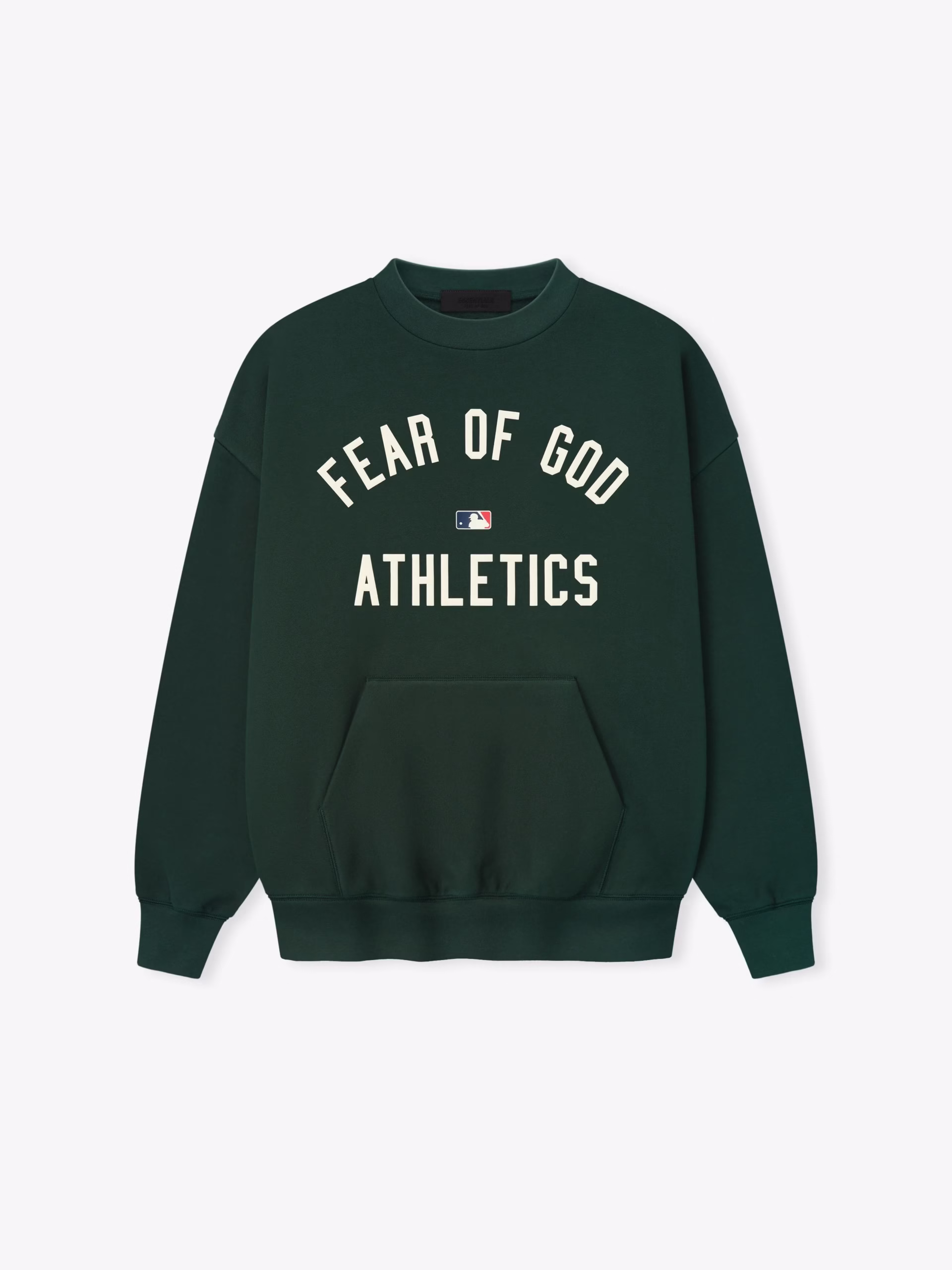 The Athletics Sport Crewneck is crafted from core fleece, offering an elevated balance of softness, structure, and lasting comfort. Cut in a relaxed sport fit, it drapes with more ease through the body and extended length compared to the Essentials classic silhouette. The front features a bold puffer-print graphic reading “Fear of God Athletics” alongside the MLB insignia, while the back is finished with the official A's logo. Additional details include a kangaroo pocket, rib-knit collar, cuffs and hem. The signature rubberized Fear of God Essentials label accents the back.