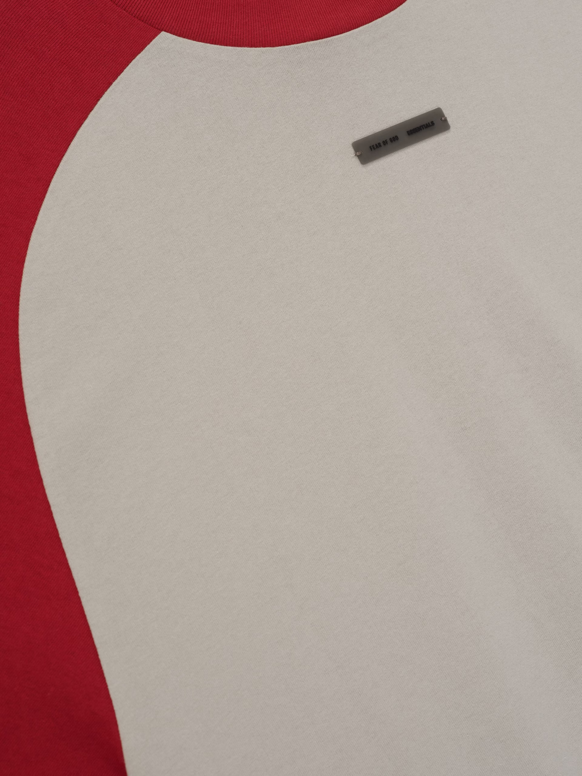 The Baseball Tee is made from medium-weight 100% cotton jersey. The rib-knit crewneck tee features an oversized fit with baseball-inspired 3/4 raglan sleeves that contrast in color. Branding includes the Fear of God Essentials label at the front.
