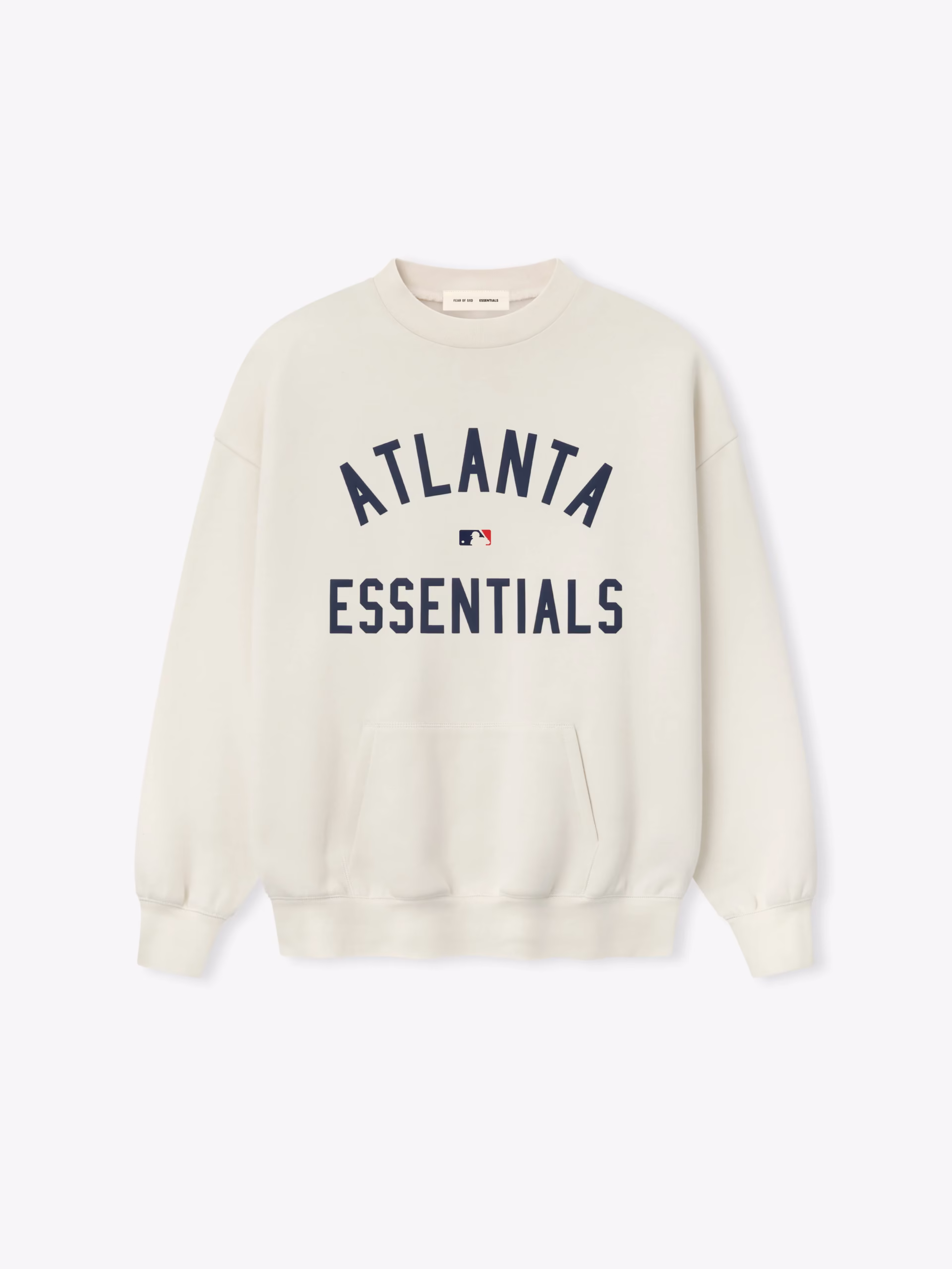 The Braves Sport Crewneck is crafted from core fleece, offering an elevated balance of softness, structure, and lasting comfort. Cut in a relaxed sport fit, it drapes with more ease through the body and extended length compared to the Essentials classic silhouette. The front showcases a puffer print with the "Atlanta Essentials" lockup, along with the iconic MLB logo. On the back, you'll find the vintage Atlanta Braves "A" logo. Additional details include side seam pockets, and rib-knit bindings at the collar, cuffs, waist hem, and a rubberized Fear of God label Essentials is attached at the back collar.