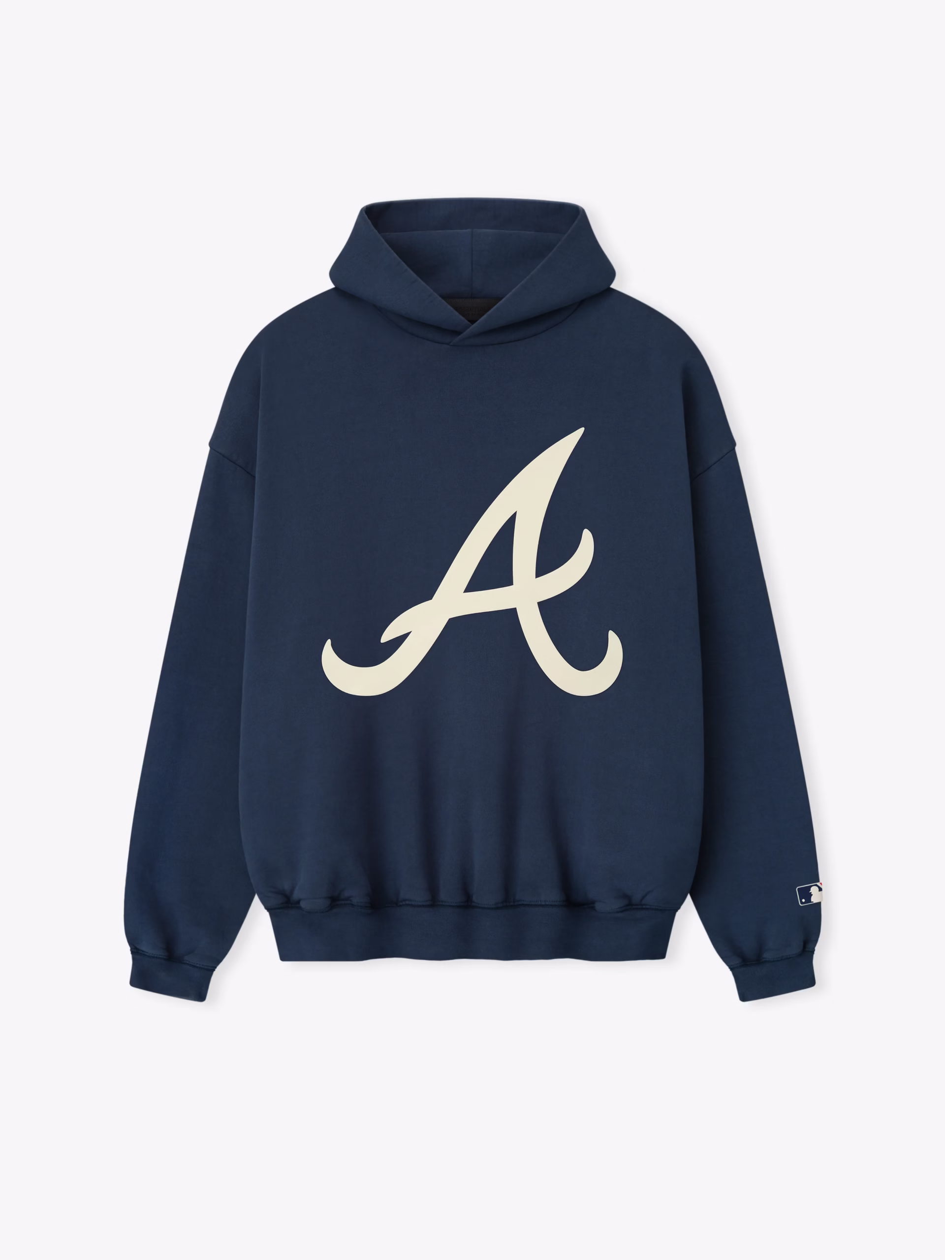 The Braves Sport Hoodie is crafted from core fleece, offering an elevated balance of softness, structure, and lasting comfort. Cut in a relaxed sport fit, it drapes with more ease through the body and extended length compared to the Essentials classic silhouette. The front features a bold puffer-print graphic reading "Atlanta Essentials" alongside the official MLB insignia, while the back is finished with the authentic Atlanta "A" logo. Additional features include a contrasting double-layered hood, side seam pockets, elastic bindings at the cuffs and waist hem. The signature rubberized Fear of God Essentials label accents the hood.