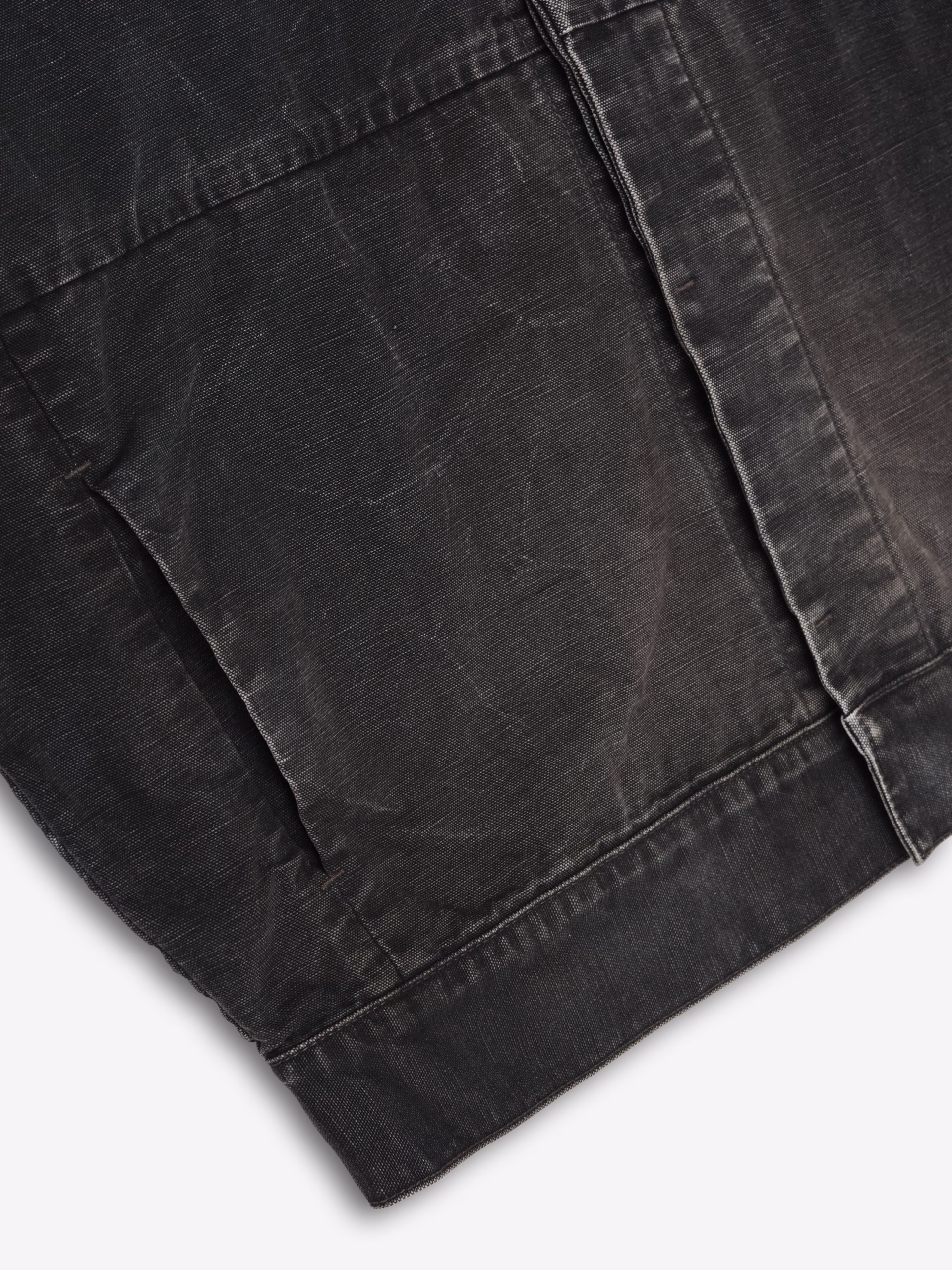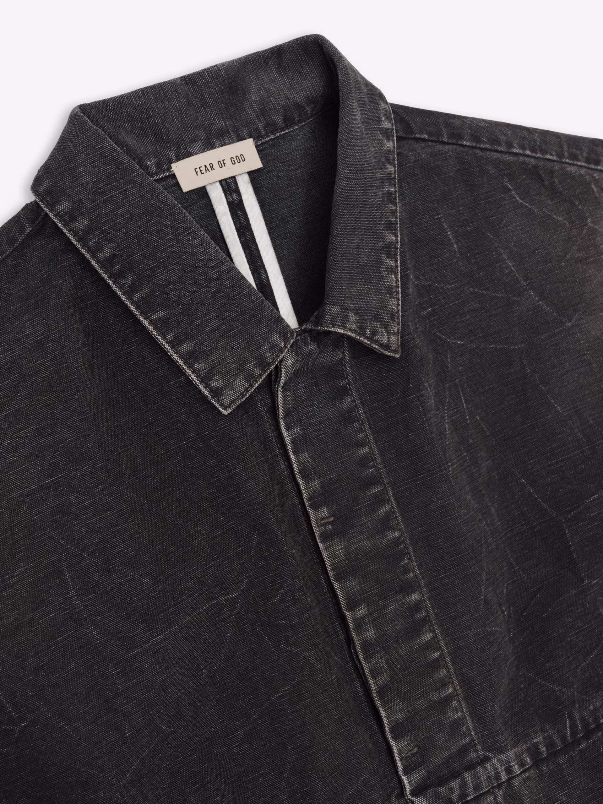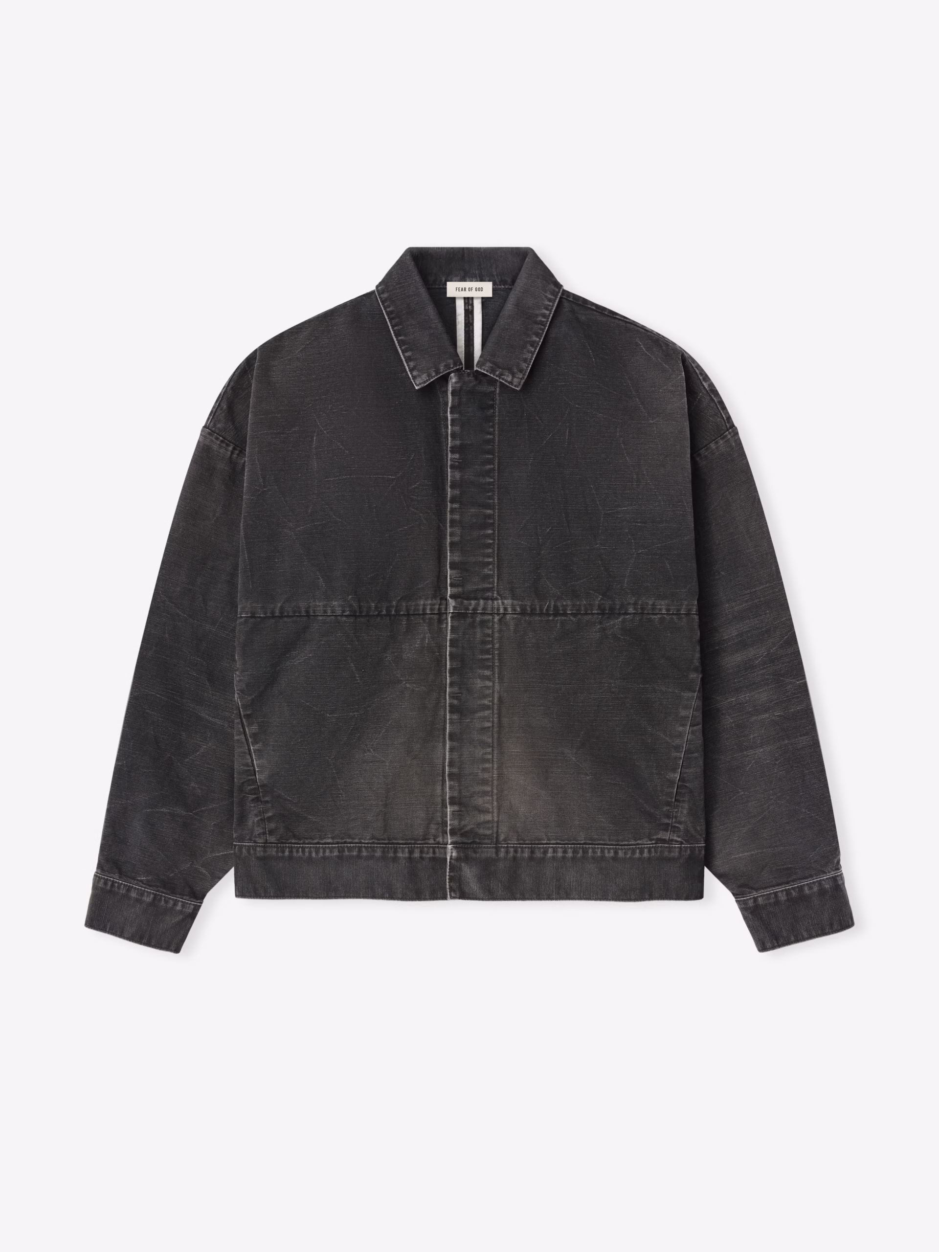 The Utility Jacket is made in Japan from 100% cotton canvas with a garment wash and a sunfade, featuring a cropped and boxy fit for a vintage silhouette. The utility style includes a shirt collar, antique metal hardware, and side pockets. Additionally, a Fear of God label is located at the back collar.