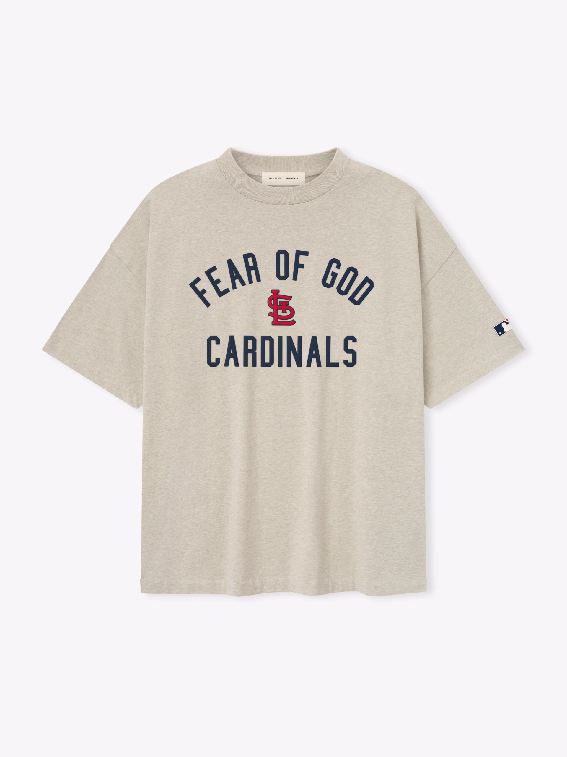The Cardinals 90s Tee is cut from 100% cotton jersey, offering a soft yet substantial hand feel. Designed in an oversized 90s-inspired silhouette, it features exaggerated proportions with dropped shoulders for a relaxed drape. The front is defined by a bold puffer-print application of the "Fear of God Cardinals" lockup, alongside the MLB insignia on the sleeve. Across the back, an official St. Louis logo anchors the piece with the signature rubberized Fear of God Essentials label at the collar.