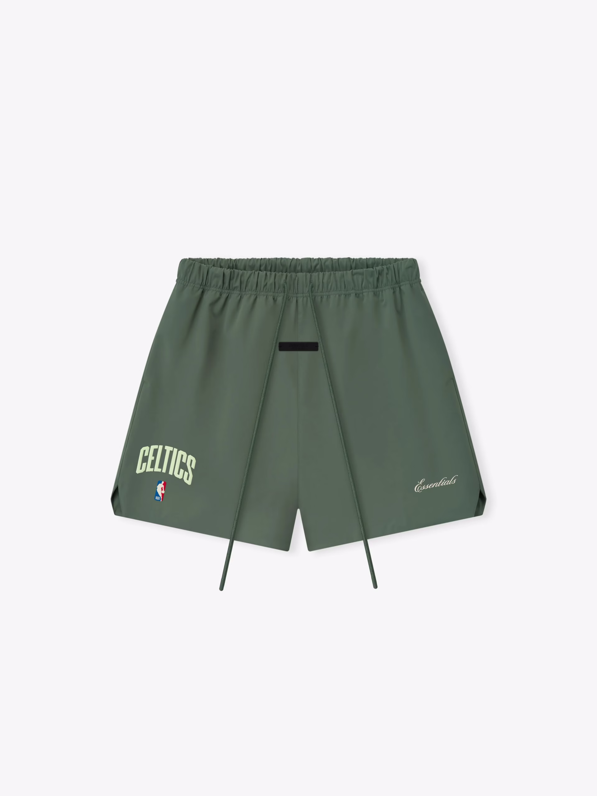 The Celtics Classic Short is made from a stretch-woven fabric and finished with a full mesh liner, delivering breathable comfort within a timeless athletic-fit silhouette. A CELTICS NBA logo lockup are branded on leg and script Essentials print complements the other. Additional details include an encased elastic waistband with elongated drawstrings, side pockets. A Fear of God Essentials rubberized label is stitched on the center front.