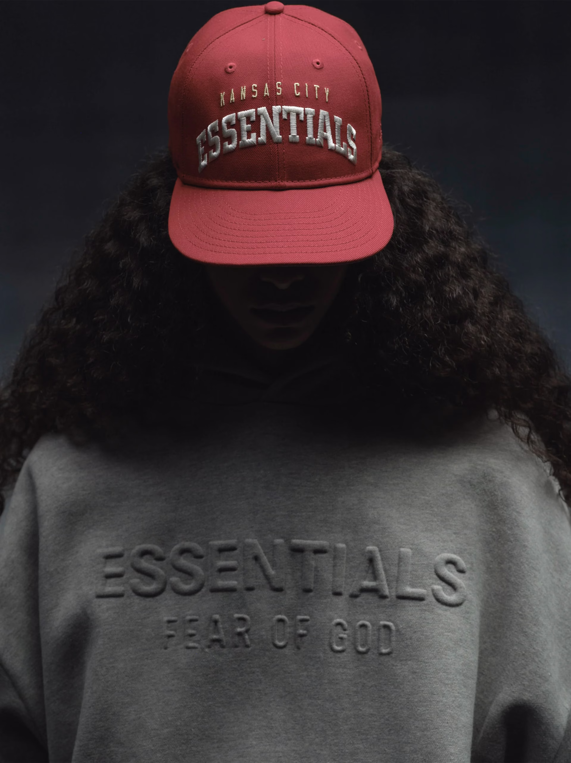The Fear of God Essentials Chiefs 9Fifty RC Snapback Cap features a "Kansas City Essentials" lockup, complemented by the official Kansas City Chiefs logo at the back. The 9Fifty RC or "Retro Crown" is designed for a more vintage, casual feel. Additional features include an embroidered New Era logo on the side and an adjustable snapback closure at the rear.
