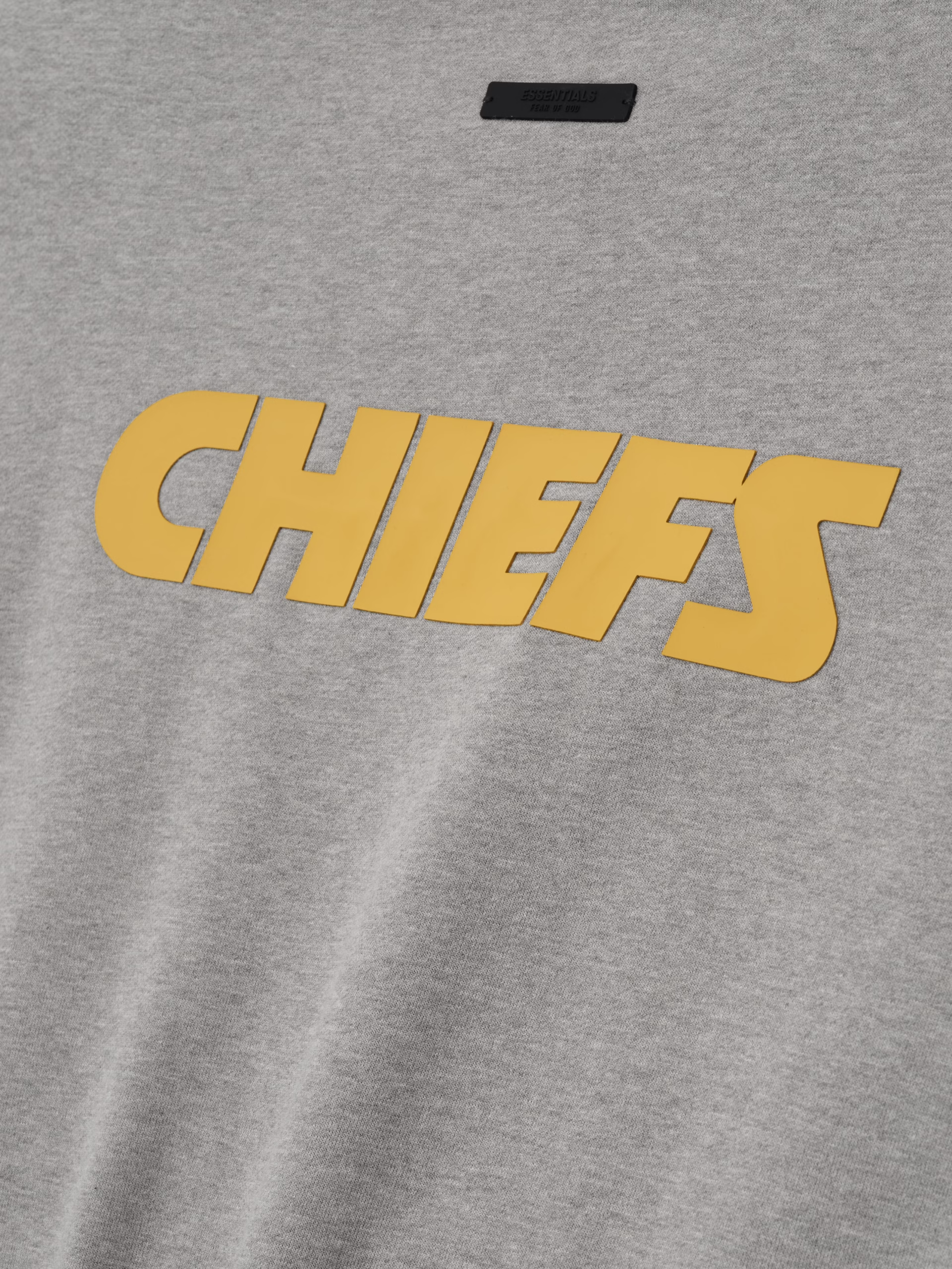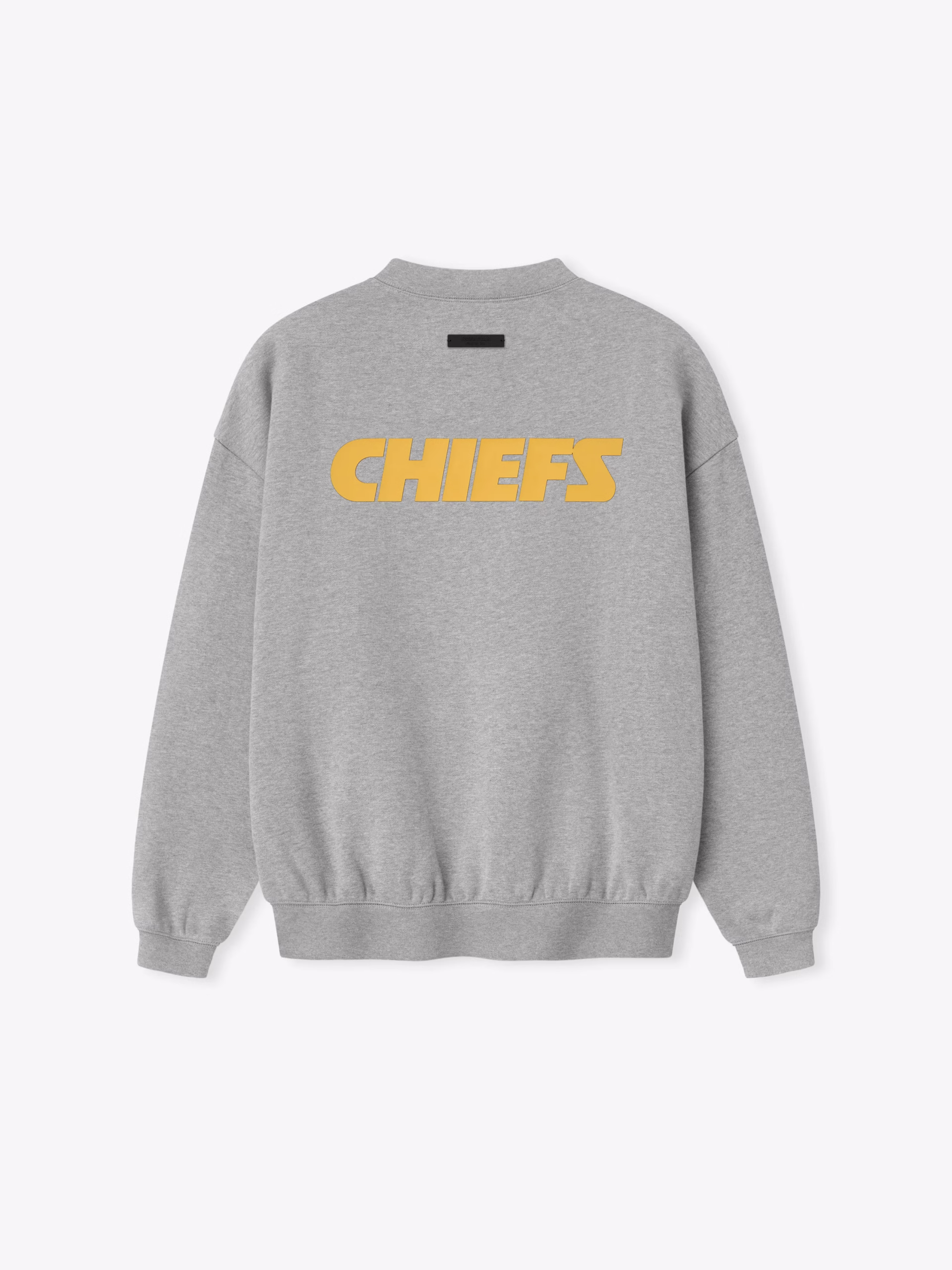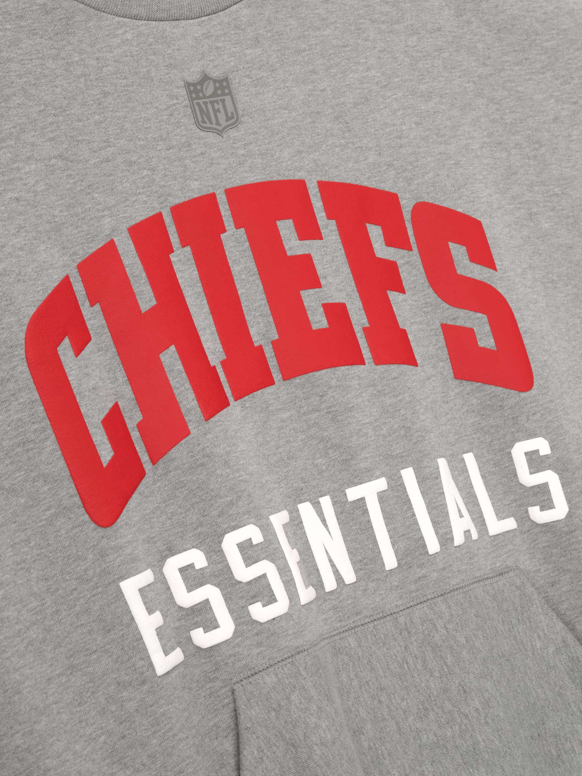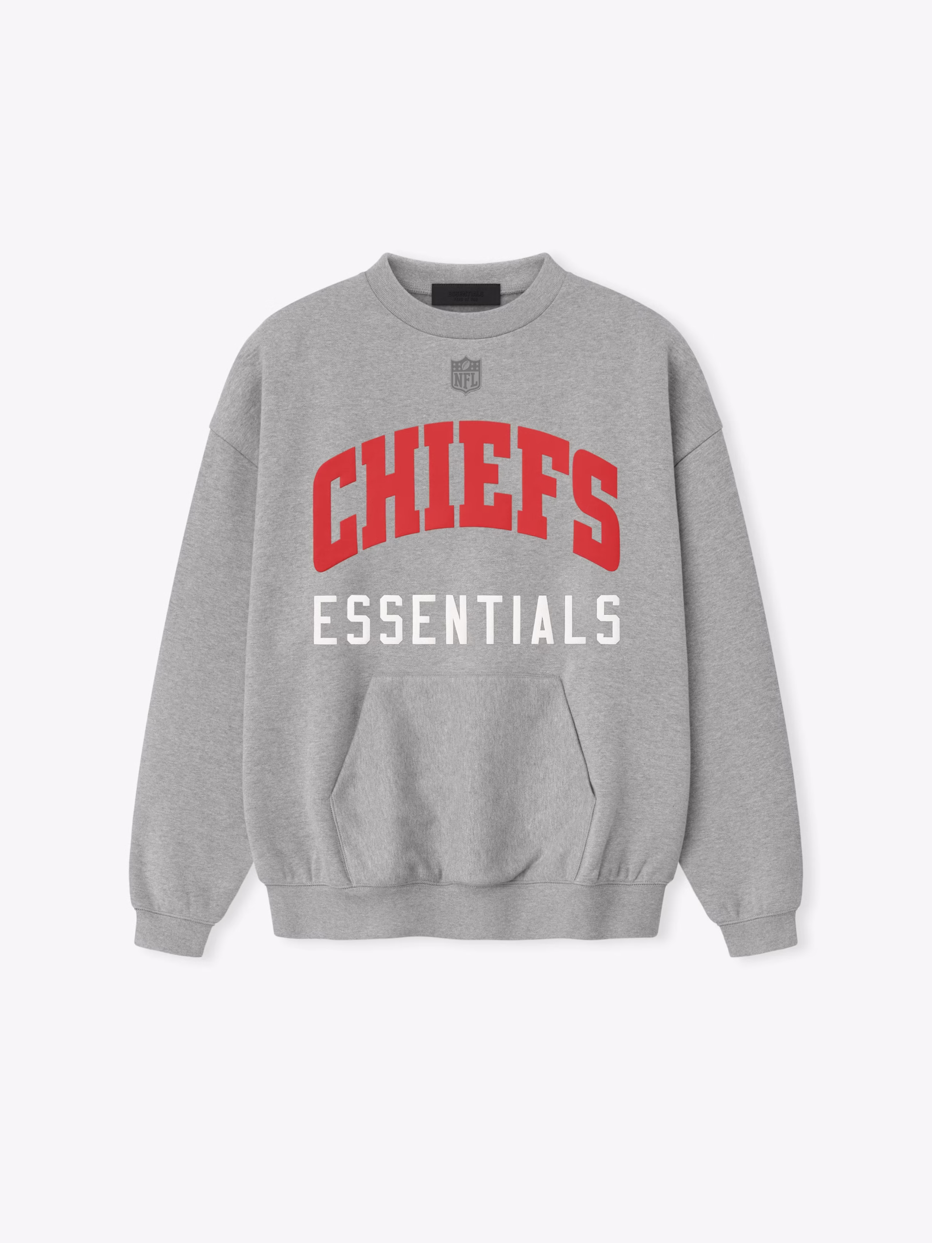 The Chiefs Sport Crewneck is crafted from heavy 480gsm core fleece and cut in a relaxed sport fit. The front features a bold "Chiefs Essentials" puff-print graphic, while the back displays the official Kansas City Chiefs logo. Additional details include a kangaroo pocket and rib-knit collar, cuffs, and waist hem. The look is finished with the signature rubberized Fear of God Essentials label.