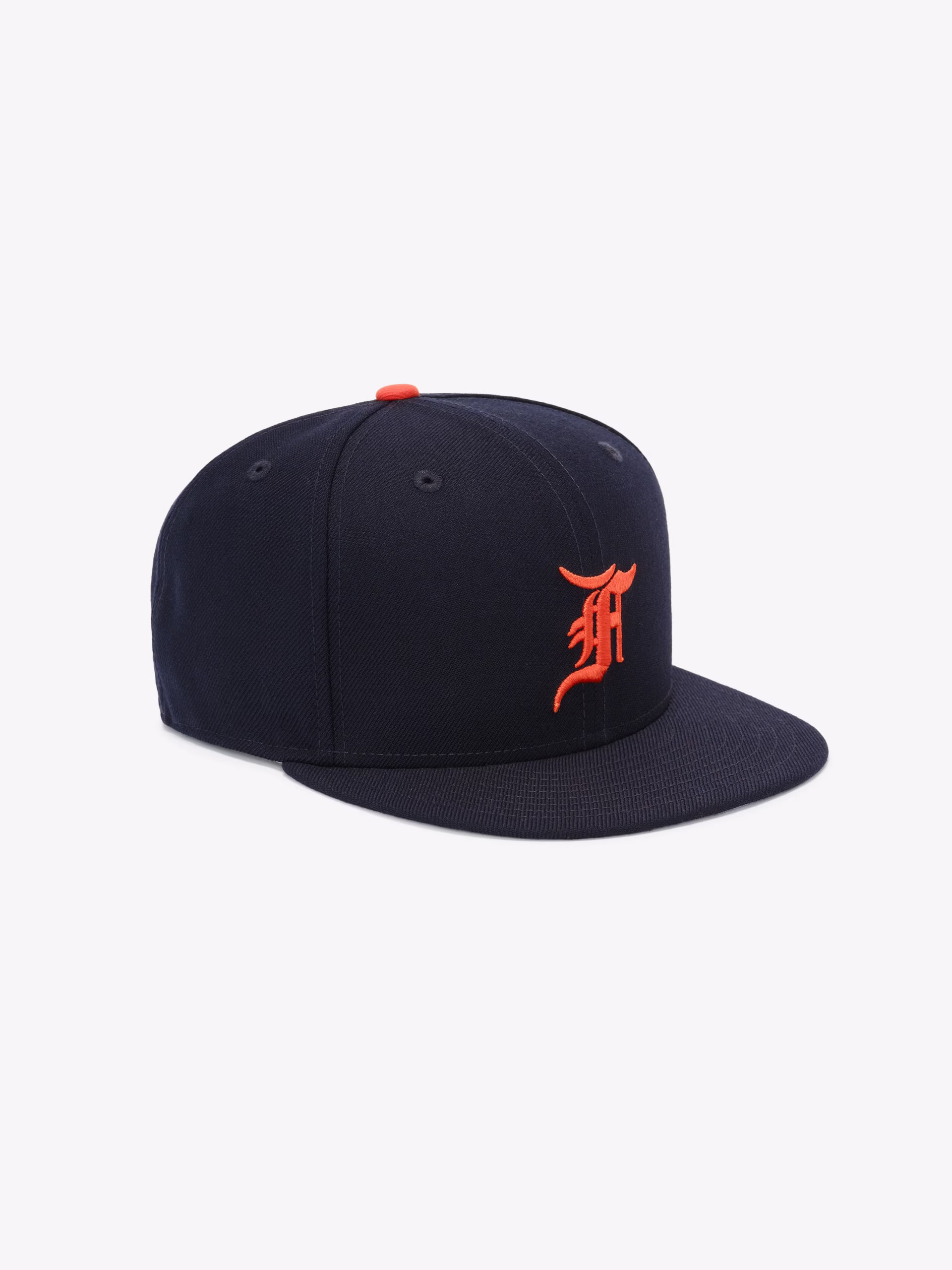 The Fear of God Essentials Detroit Tigers 59Fifty Fitted Cap features an embroidered Fear of God script logo at the front with a Fear of God label at the back. Additional details include a Tigers team color fabrication with a grey undervisor.