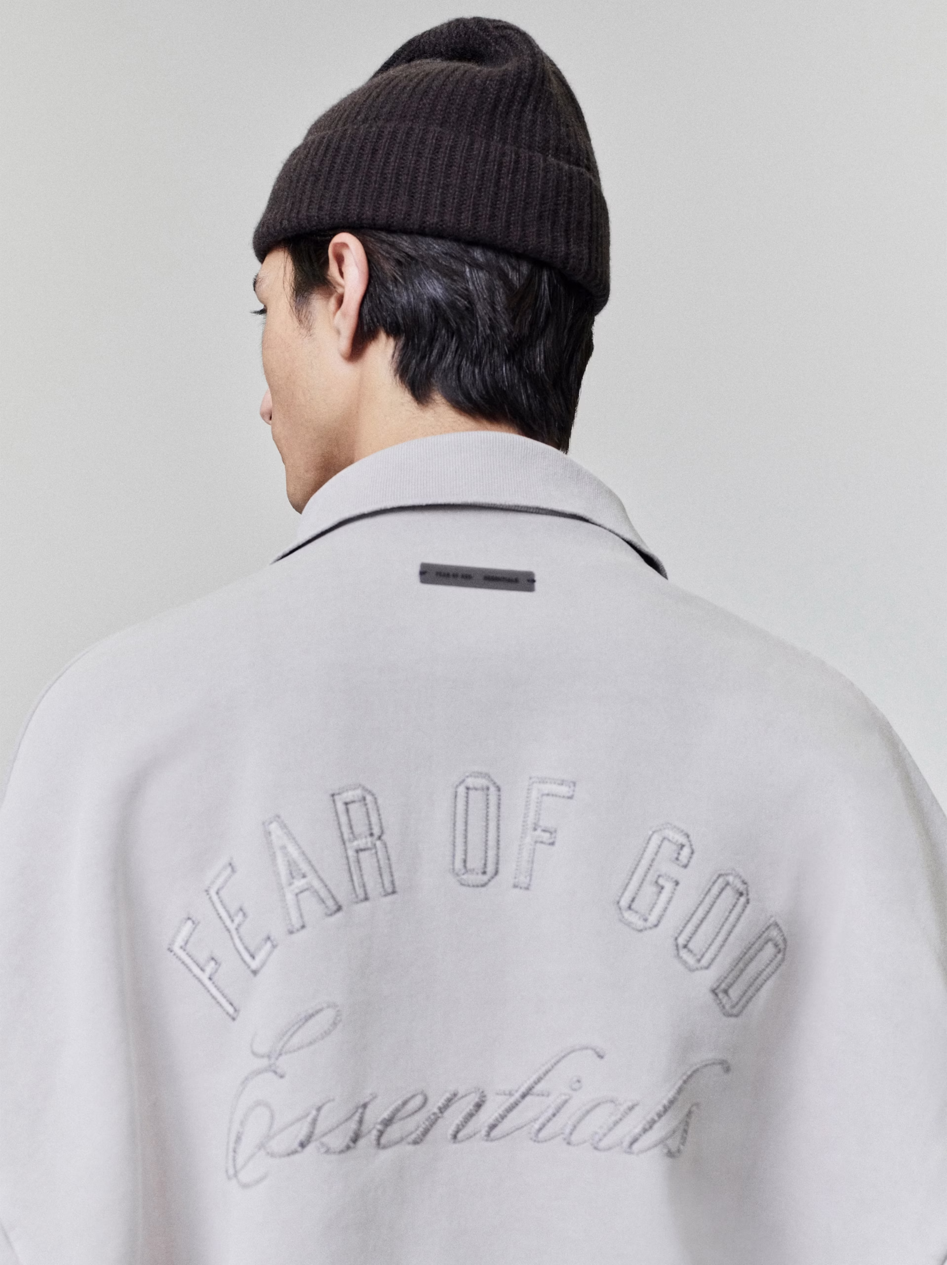 The Classic Fleece Polo is crafted from 520gsm heavy fleece and treated with a pigment dye to create rich depth of color. Its classic silhouette is defined by an embroidered script “E” on the front, and Fear of God Essentials logo on the back. Details include a rib-knit polo collar, cuffs, and waist-hem. A Fear of God Essentials rubberized label stitched at the back collar.