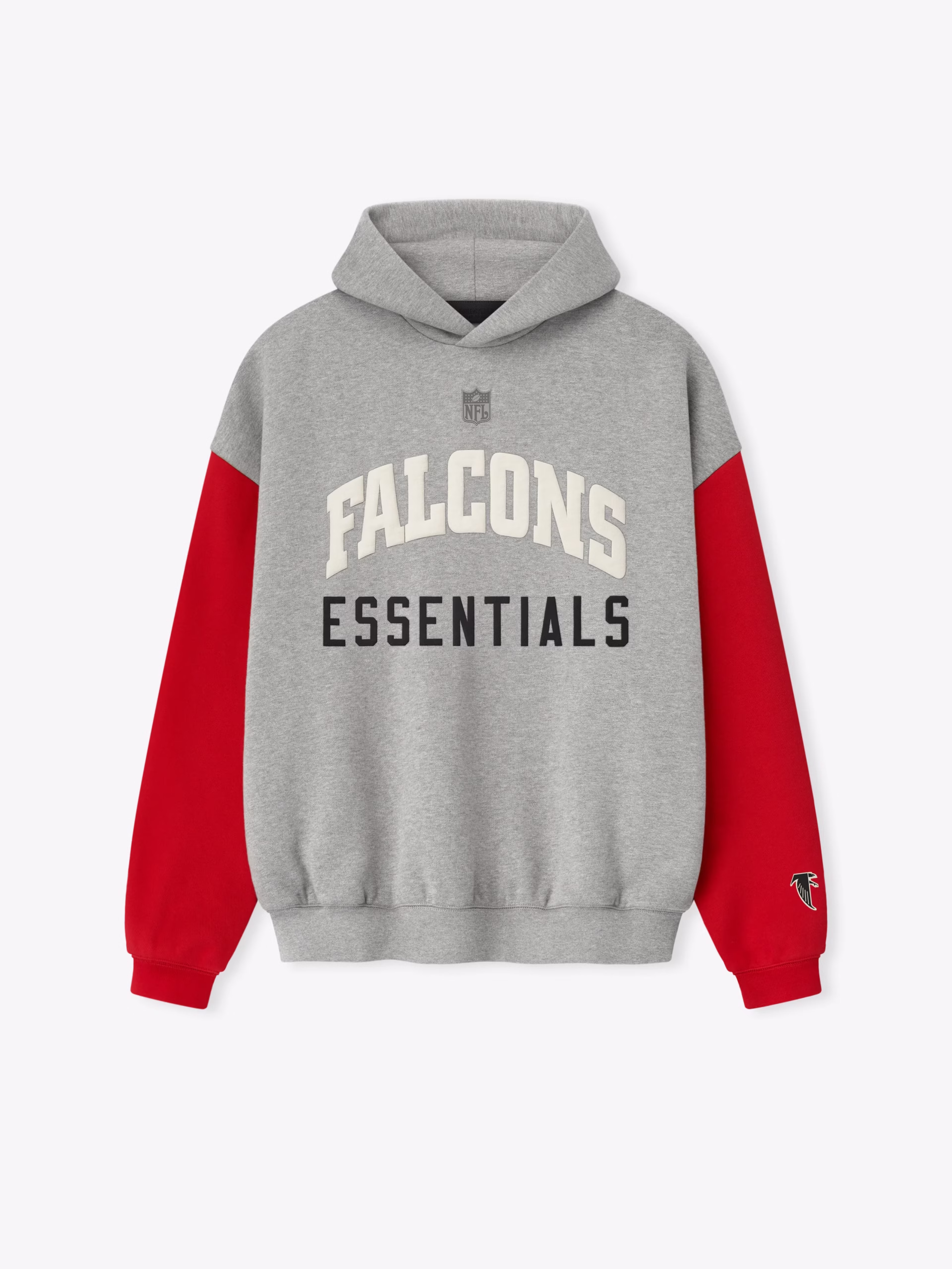 The Falcons Sport Hoodie is crafted from heavy 480gsm core fleece and cut in a relaxed sport fit. The front features a bold "Falcons Essentials" puff-print graphic paired with the official NFL shield logo. Additional features include, contrasting sleeves, side pockets, rib-knit at the cuffs and waist hem. The signature rubberized Fear of God Essentials label accents the hood.