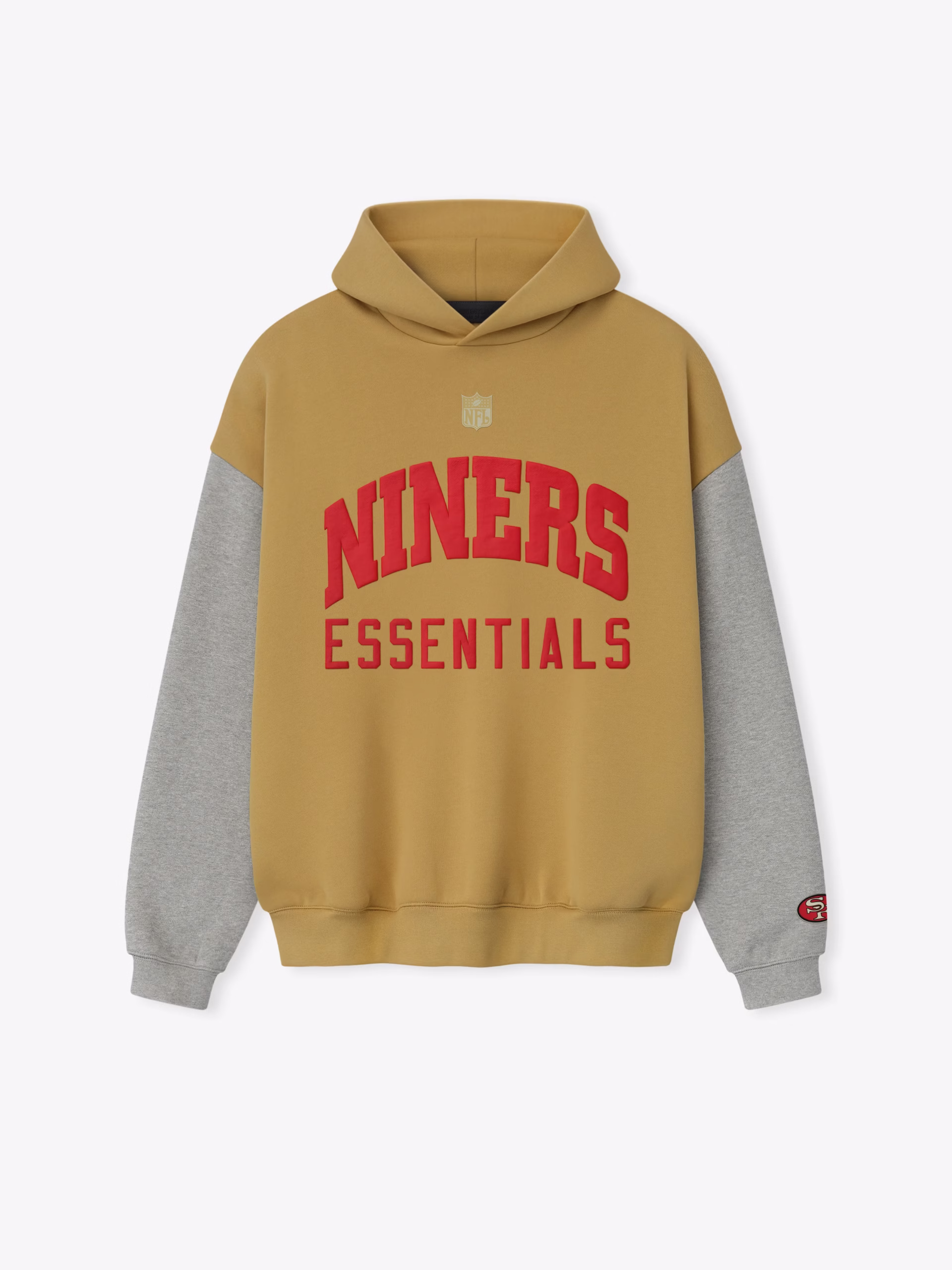 The Forty Niners Sport Hoodie is crafted from heavy 480gsm core fleece and cut in a relaxed sport fit. The front features a bold "Niners Essentials" puff-print graphic paired with the official NFL shield logo. Additional features include, contrasting sleeves, side pockets, rib-knit at the cuffs and waist hem. The signature rubberized Fear of God Essentials label accents the hood.