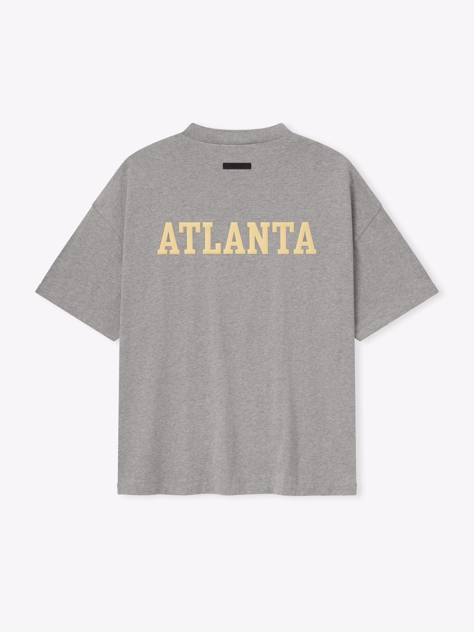 The Fear of God Essentials Hawks Tee is made from 100% cotton jersey and features a relaxed 90s fit with dropped shoulders and a rib-knit crewneck. The front displays a puffer print of the "Fear of God Hawks" lockup, along with the iconic NBA logo. The back features the word "Atlanta"and a Fear of God Essentials rubberized label at the back collar.