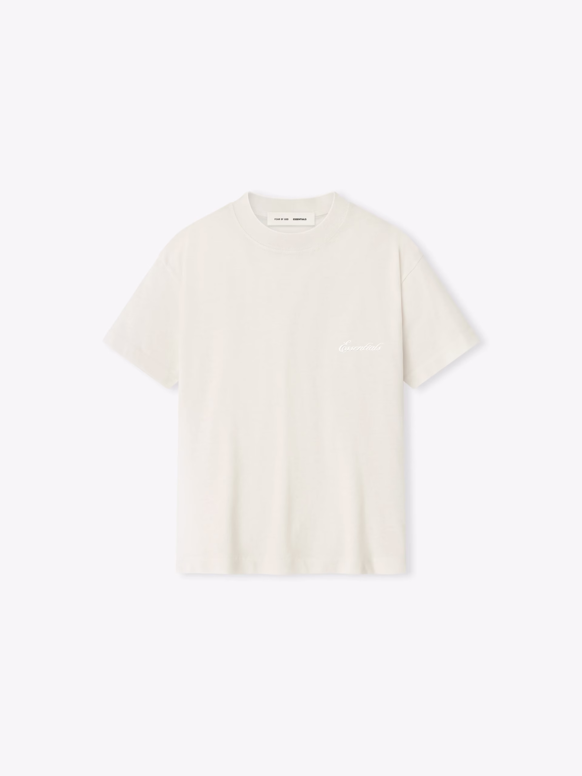 The Kids Essential Tee is made from lightweight 60% cotton, 40% polyester jersey. The rib-knit crewneck tee features a vintage fit to shape more closely to the body with shorter sleeves. Branding includes an embroidered Essentials script logo on front and the Fear of God Essentials label at the back collar.