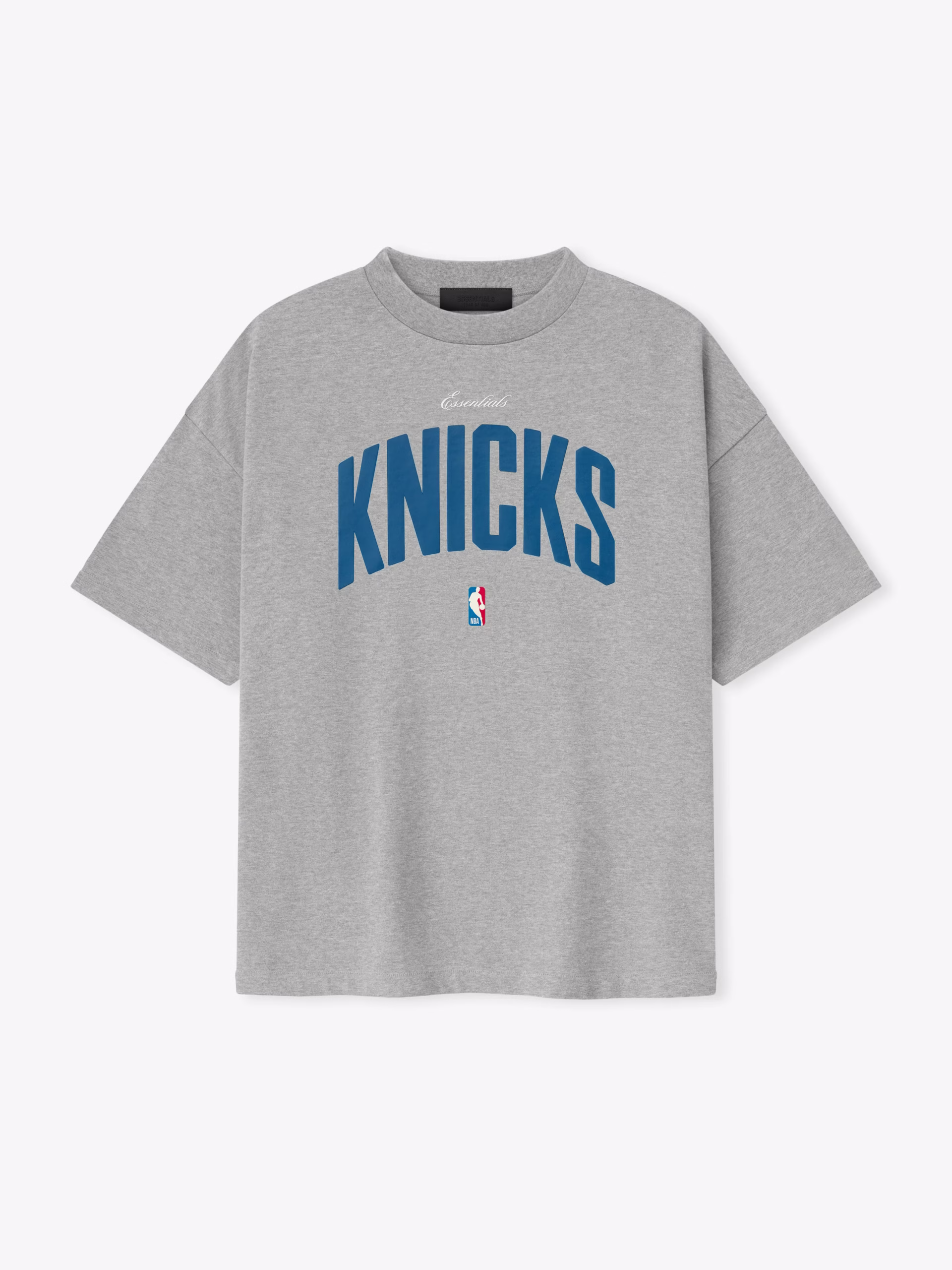 The Knicks 90s Tee is cut from 100% cotton heavy jersey, offering a soft yet substantial hand feel. Designed in an oversized 90s-inspired silhouette, it features exaggerated proportions with dropped shoulders for a relaxed drape. The front is defined by a puff-print application of the "ESSENTIALS KNICKS" lockup alongside the NBA insignia.. The signature rubberized Fear of God Essentials label at the collar.