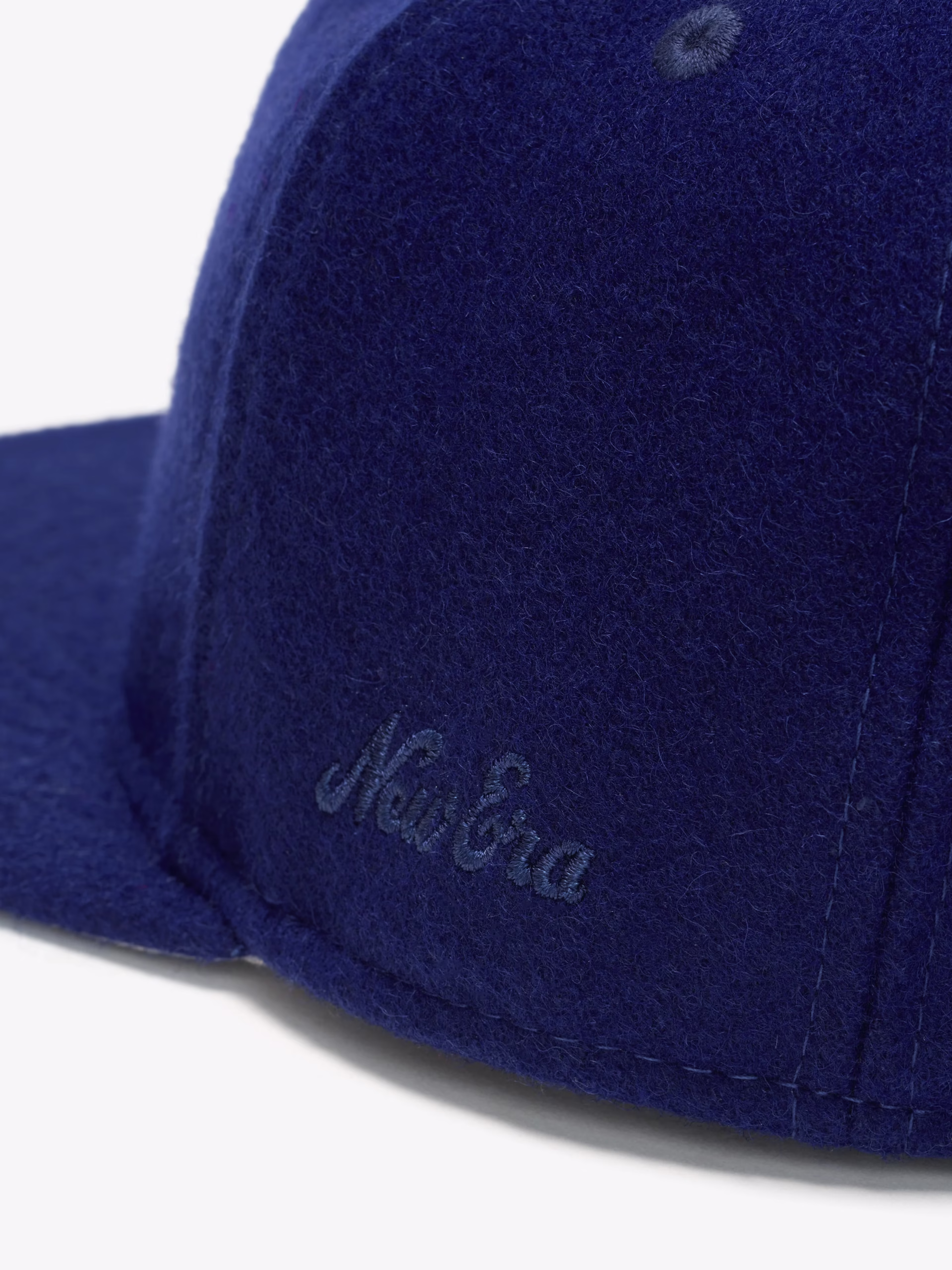 The Los Angeles Dodgers Wool Retro Crown Blue 59FIFTY Fitted Cap features an embroidered Dodgers logo on the front panels, a New Era script logo at the side, and a Fear of God label at the back. Its heavily textured wool construction and classic green undervisor pay tribute to vintage pro baseball caps.