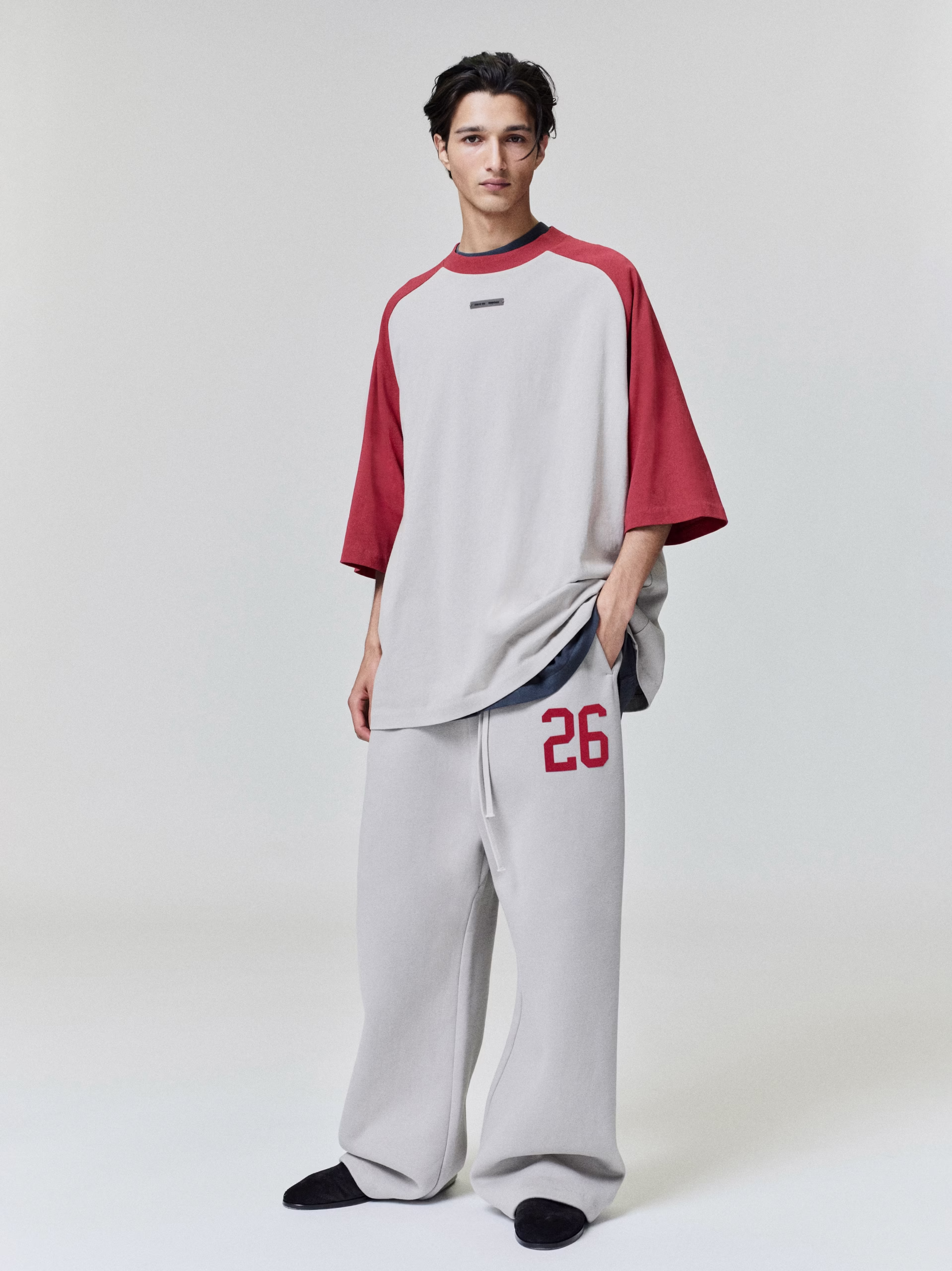 The Lounge Sweatpant is crafted from core fleece and treated with a vintage wash. Its voluminous wide-leg silhouette is defined by a “26” HD print graphic on the leg. Finishing details include an encased elastic waistband with elongated drawcords, side seam pockets, and a Fear of God Essentials rubberized label stitched at the center front.