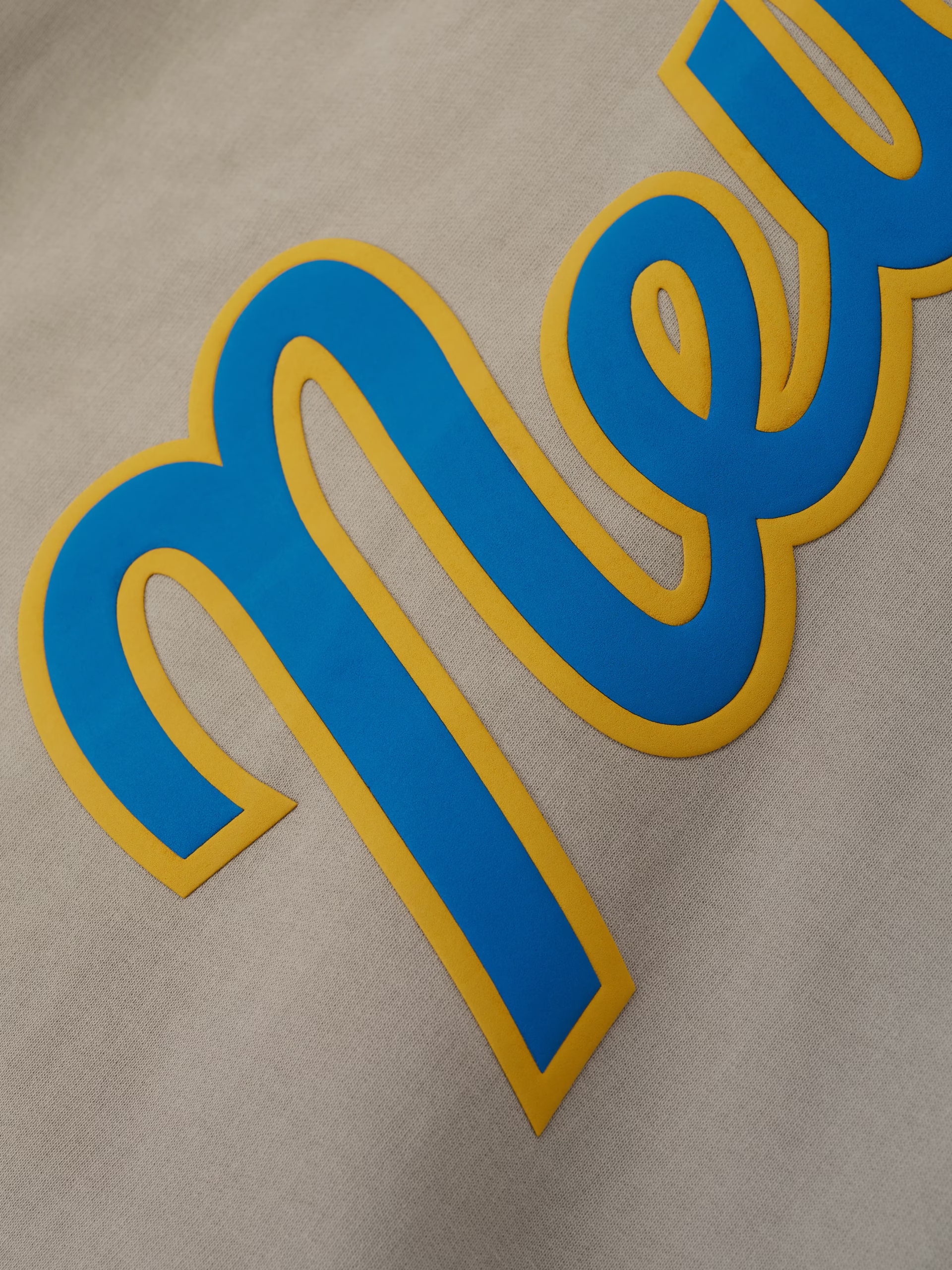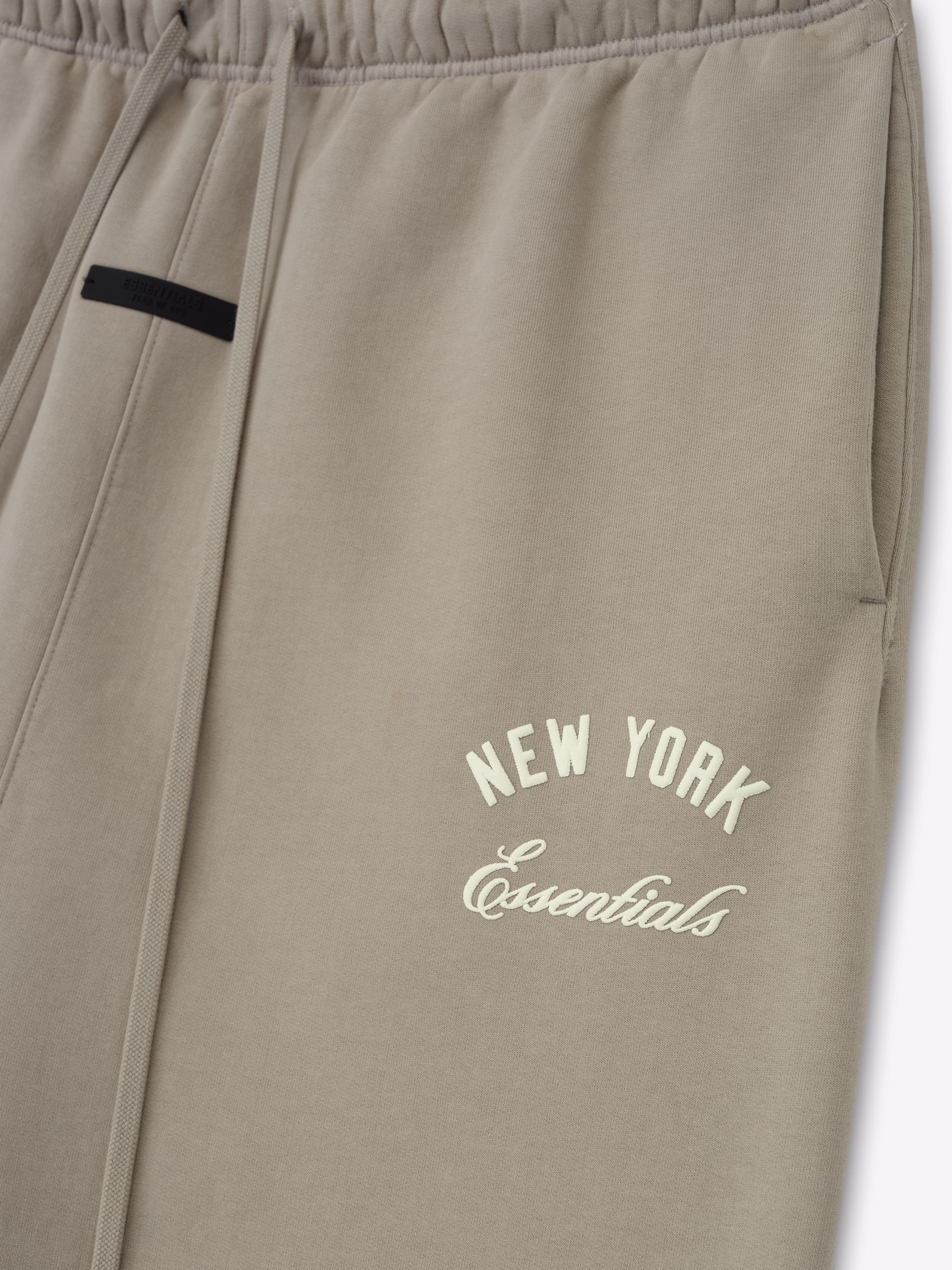 The Mets Lounge Sweatpant is crafted from pigment-dyed, heavyweight 520gsm cotton fleece, offering a softly faded, vintage feel and a voluminous wide-leg silhouette. Branding includes a bold New York HD-printed logo down one leg, complemented by a New York x Essentials script lockup on the other. Functional details include an elastic waistband with elongated drawstrings and side pockets. The look is finished with the Essentials Fear of God black bar at the center front.