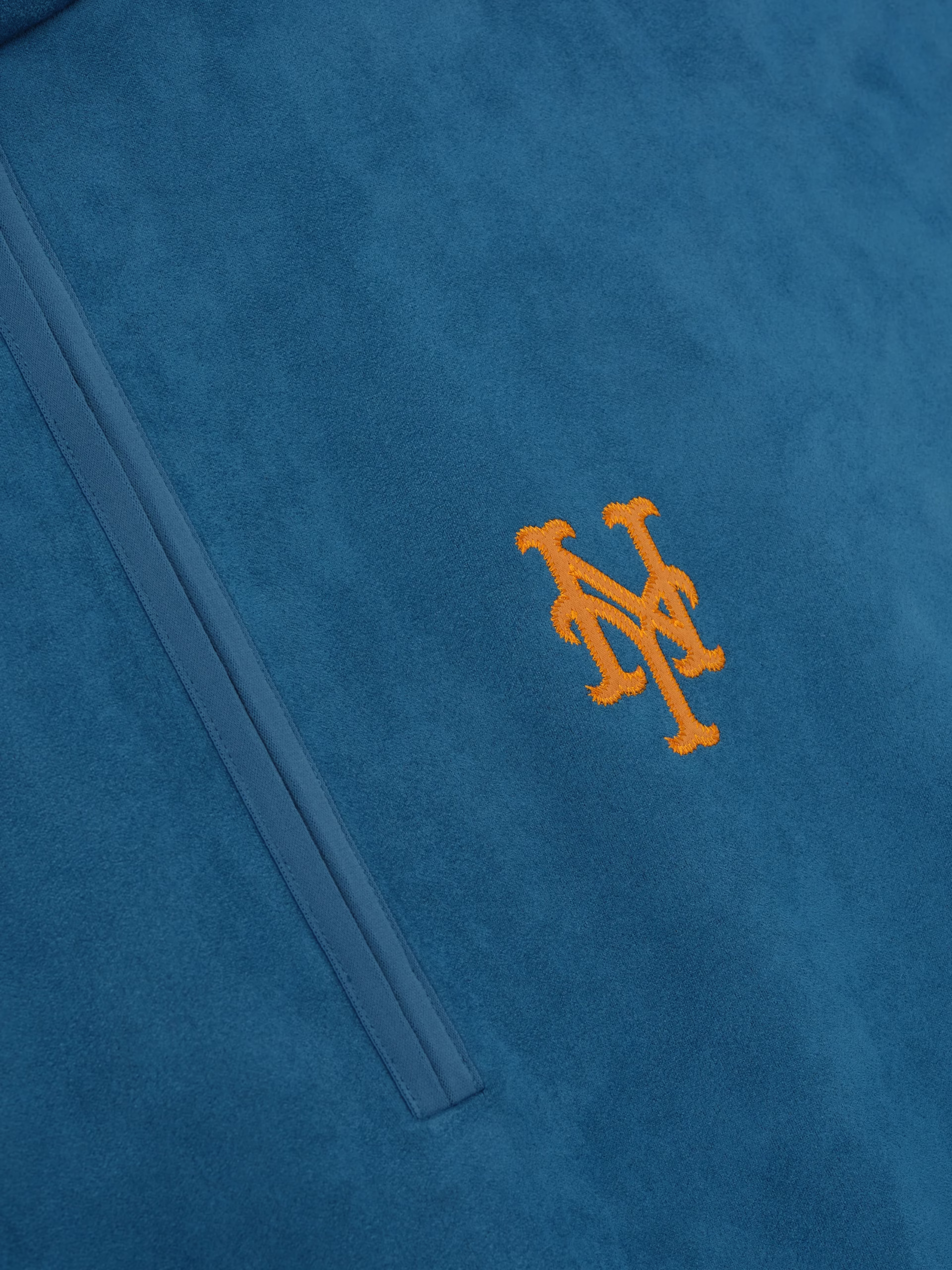The Mets Sport Half Zip is crafted from suede fleece, offering a plush, suede-like hand feel that enhances its vintage-inspired style. Designed in a relaxed Sport fit with satin-stitch branding, the front features the iconic New York Mets logo, while the back showcases a New York Essentials script lockup. Additional details include the MLB logo on the sleeve, side pockets, and elastic binding at the hemlines. The look is finished with the signature Fear of God Essentials label at the back collar.