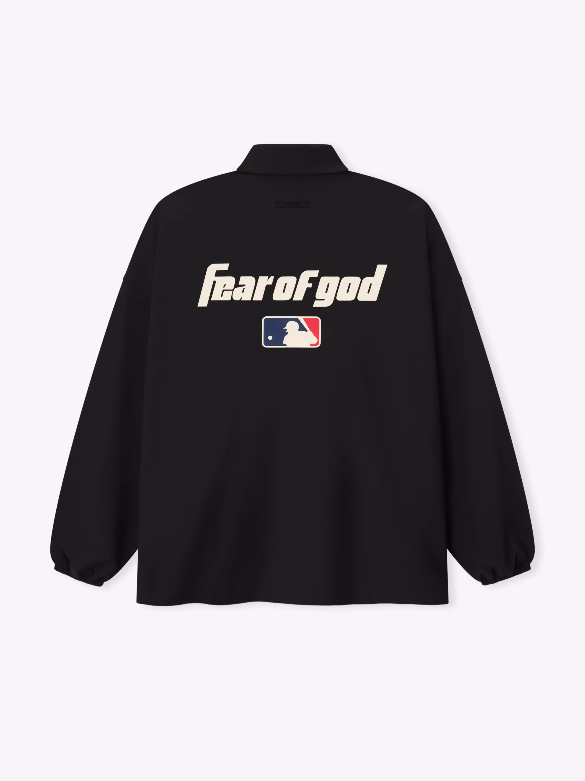 The MLB Coaches Jacket is constructed in nylon-spandex and designed with an oversized fit for layering . A Fear of God Baseball puffer print is on the front, and Fear of God MLB logo are on the back. Additional details include shirt colla, front metal snap closure, elastic waist hem with drawstring, and Fear of God Essentials label.