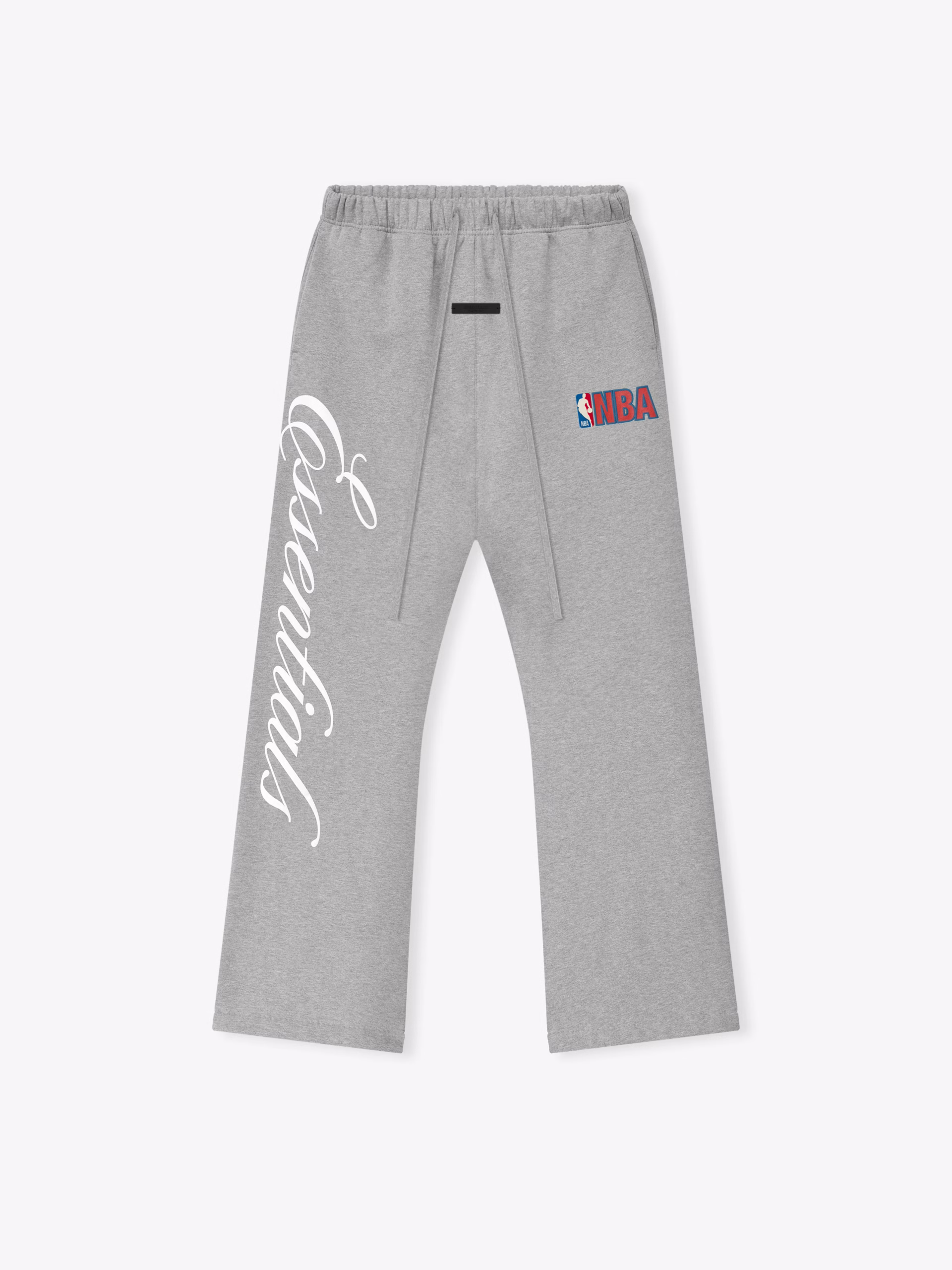 The NBA Flare Sweatpant is crafted from 480gsm heavy core fleece, offering both structure and body to its relaxed, flared-leg silhouette. One leg features a bold ESSENTIALS script print lockup, while the NBA emblem accents the other. Finishing details include an encased elastic waistband with elongated drawcords, side seam pockets, and a Fear of God Essentials rubberized label stitched at the center front.