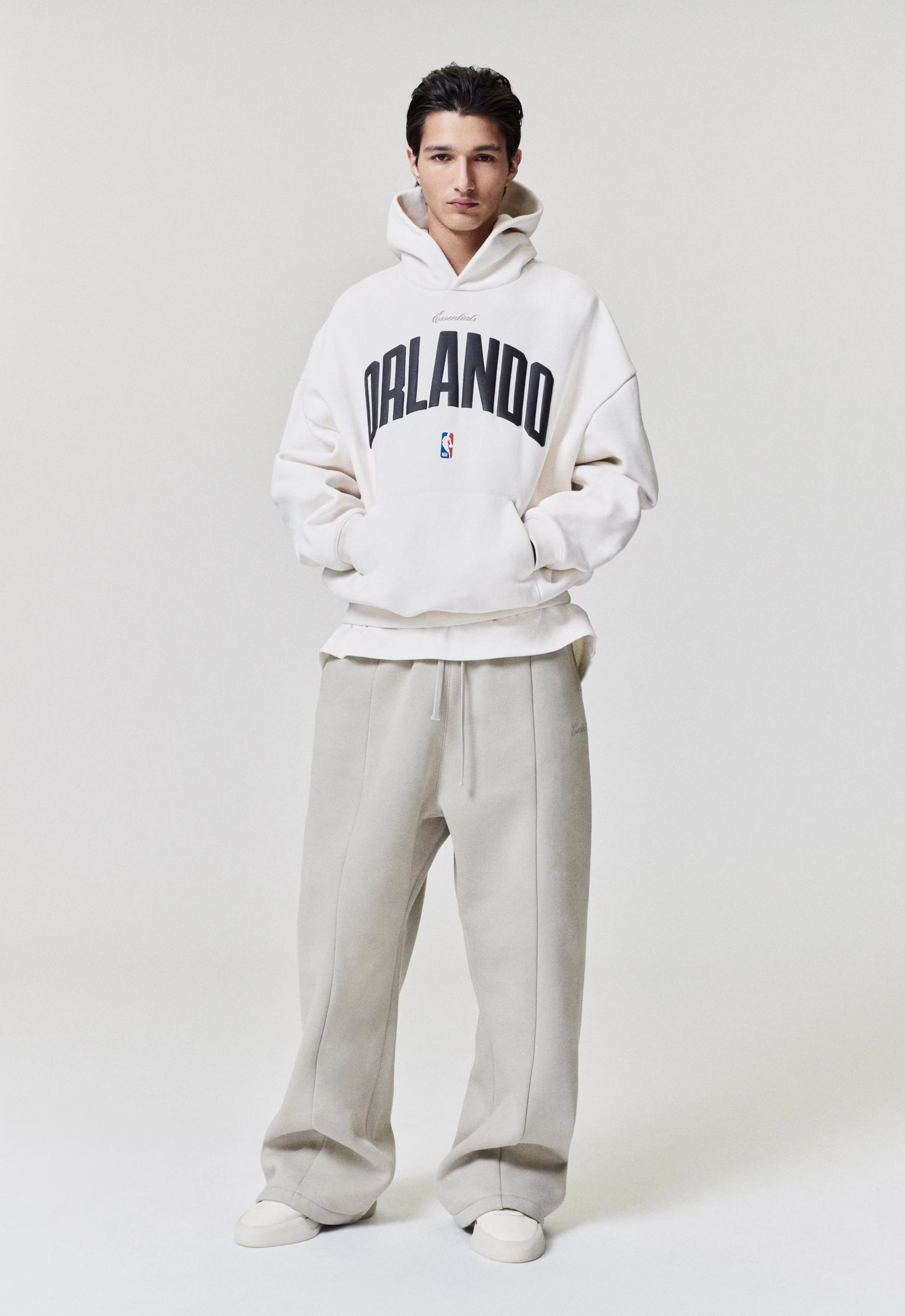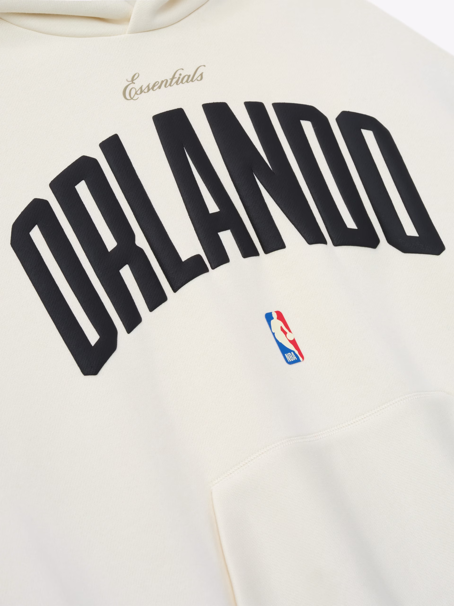 The Orlando 90s Hoodie is crafted from a heavy 480GSM core fleece and designed in a relaxed, 90s-inspired fit. The front showcases a puff-printed ESSENTIALS Orlando graphic, complemented by an official NBA logo, while the back showcases the Magic logo. Additional features include a kangaroo pocket, rib-knit cuffs and waist hem, and a Fear of God Essentials label accenting the hood.