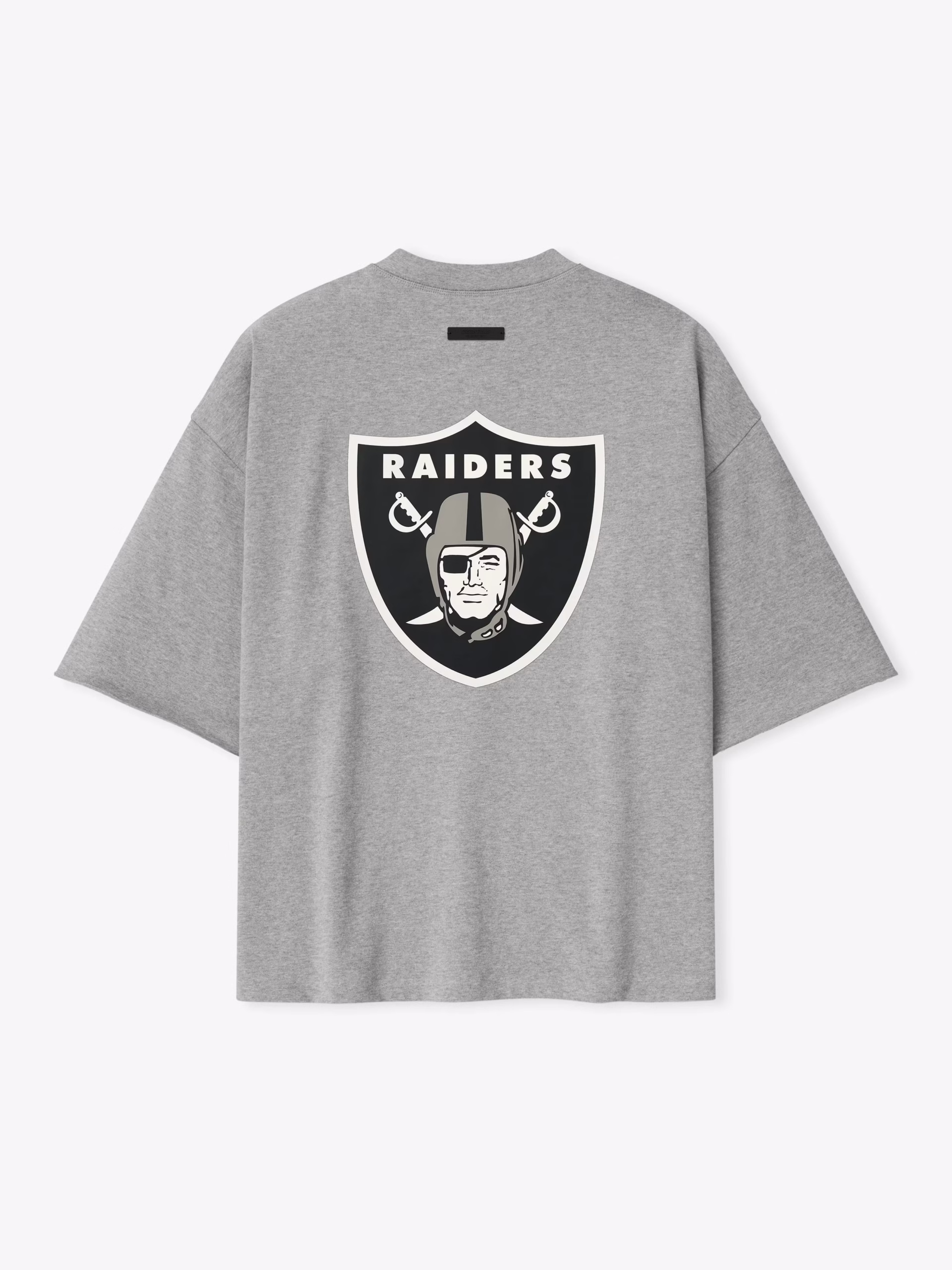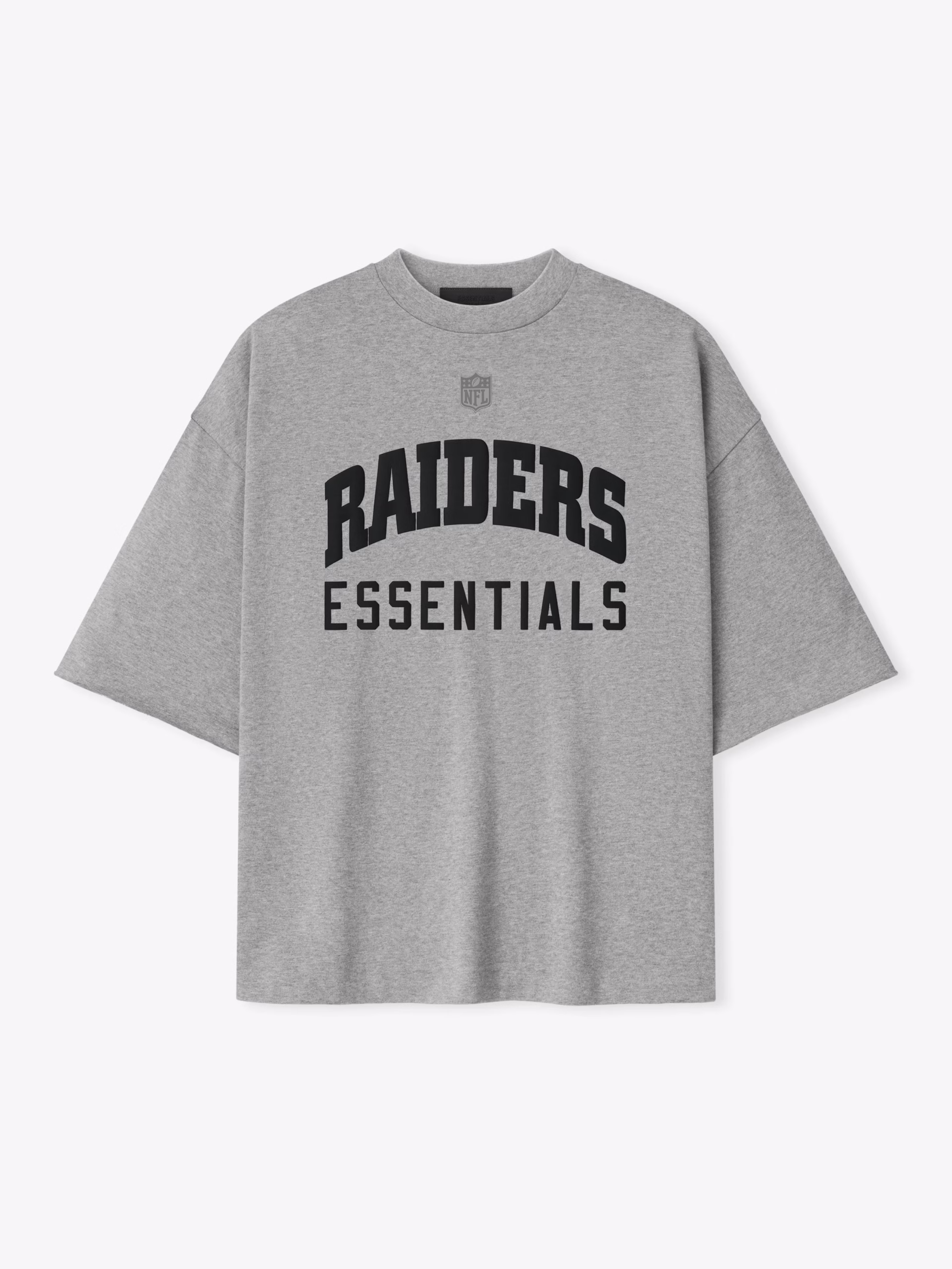 The Raiders Sport 3/4 Sleeve Football Tee is crafted from heavy 100% cotton jersey and designed in an extra-oversized fit with proportions inspired by 90s throwback football jerseys. The front features a bold "Raiders Essentials" puff-print graphic paired with the NFL shield, while the back displays the official Las Vegas Raiders logo. Additional details include rib-knit collar, and 3/4 sleeves with raw hemline. The look is finished with the signature rubberized Fear of God Essentials label.