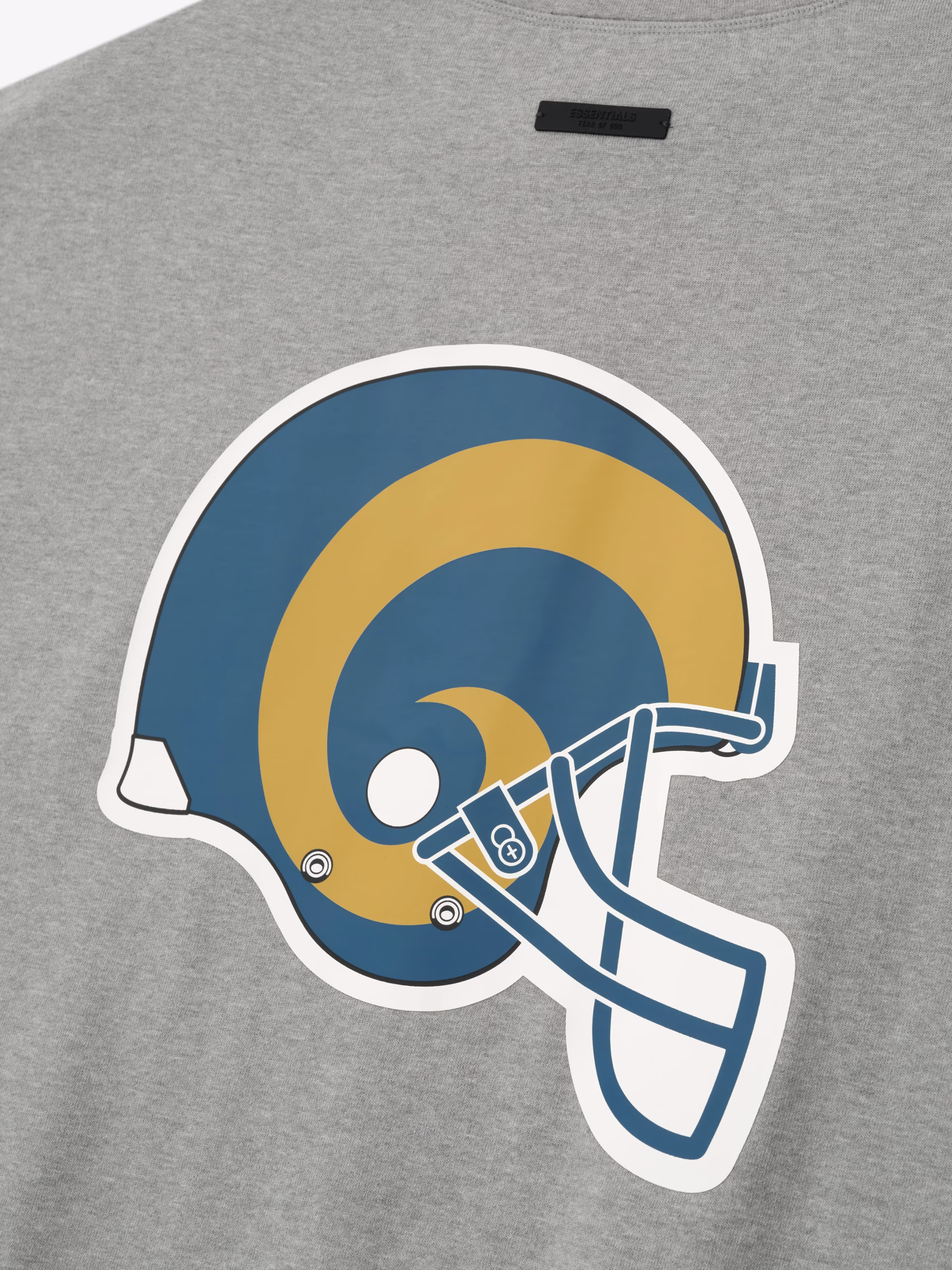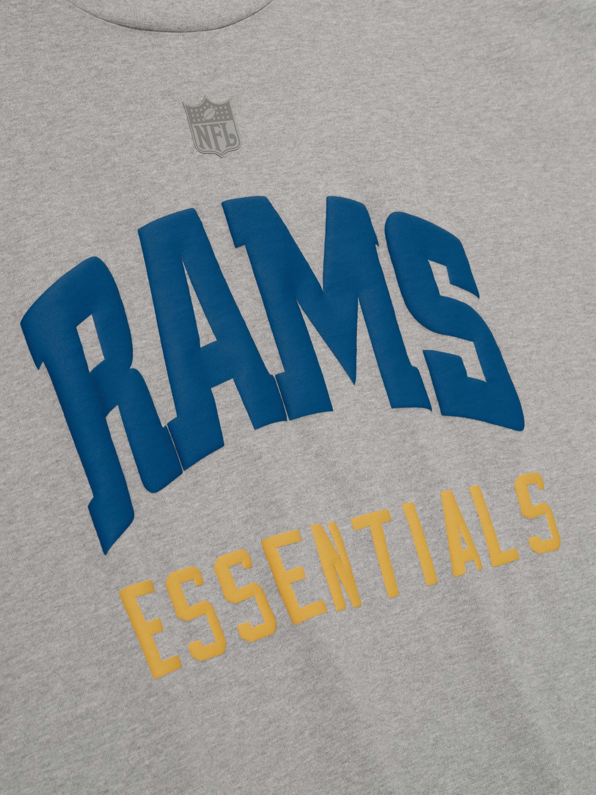 The Rams Sport 3/4 Sleeve Football Tee is crafted from heavy 100% cotton jersey and designed in an extra-oversized fit with proportions inspired by 90s throwback football jerseys. The front features a bold "Rams Essentials" puff-print graphic paired with the NFL shield, while the back displays the official Los Angeles Rams logo. Additional details include rib-knit collar, and 3/4 sleeves with raw hemline. The look is finished with the signature rubberized Fear of God Essentials label.