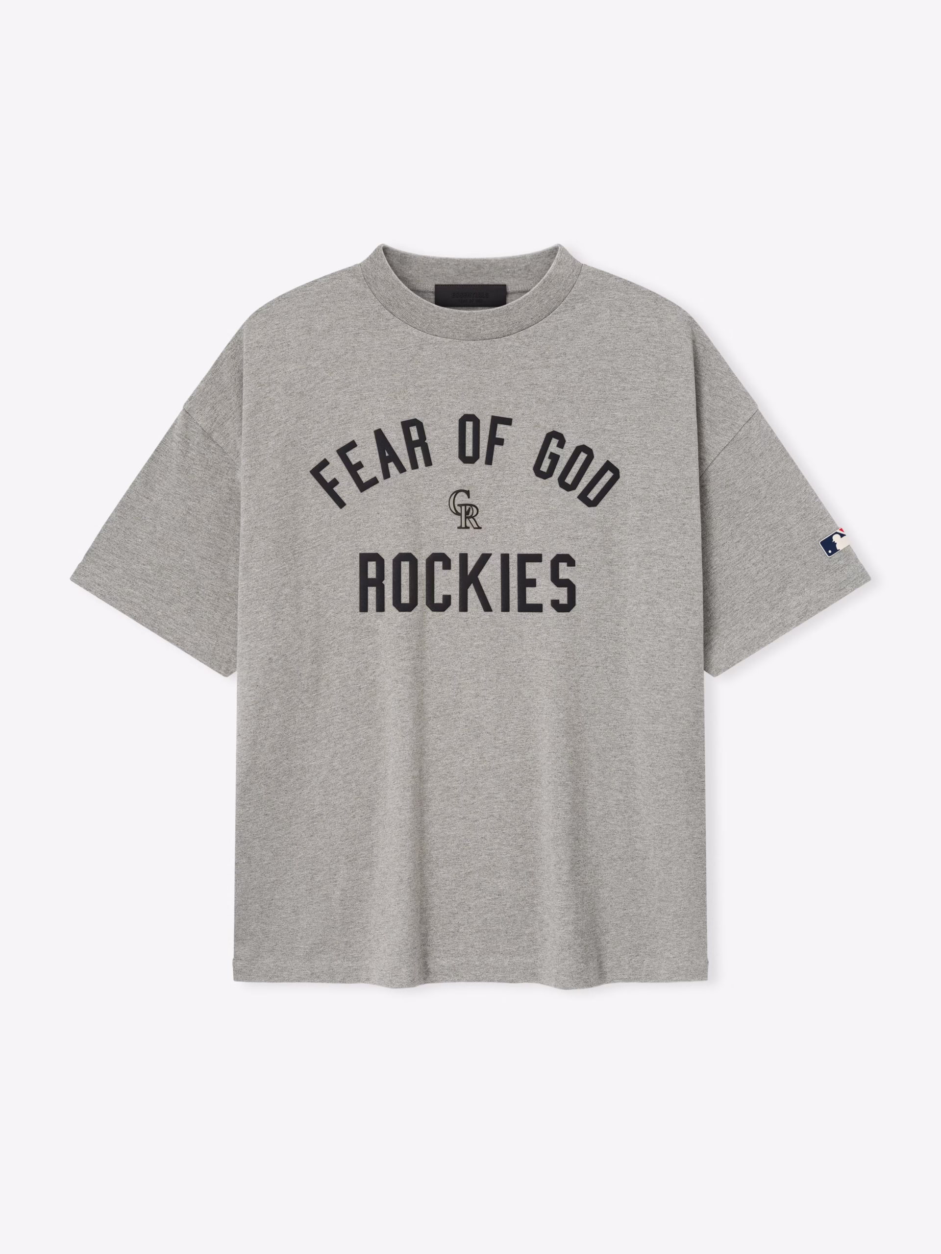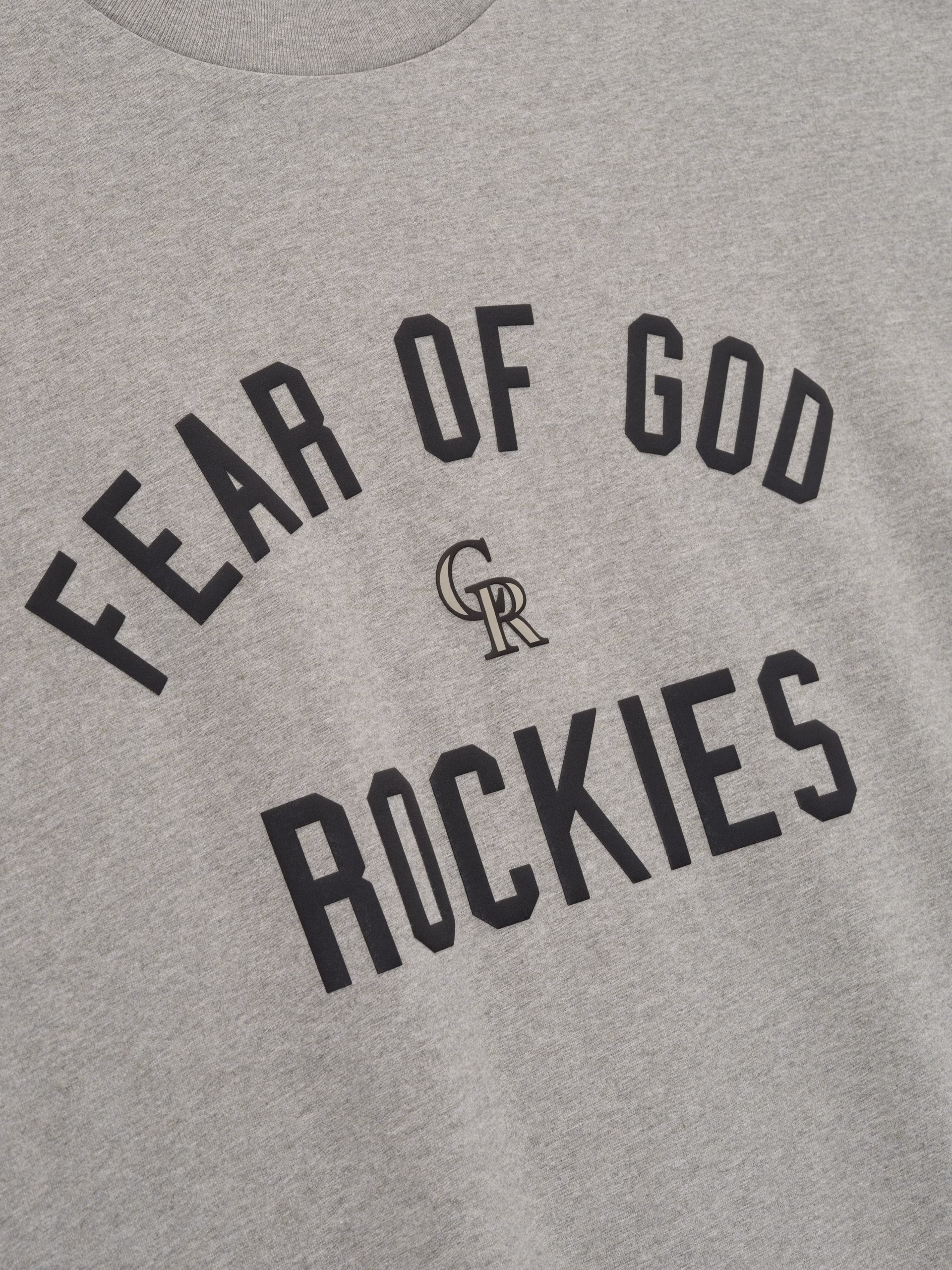 The Rockies 90s Tee is cut from 100% cotton jersey, offering a soft yet substantial hand feel. Designed in an oversized 90s-inspired silhouette, it features exaggerated proportions with dropped shoulders for a relaxed drape. The front is defined by a bold puffer-print application of the "Fear of God Rockies" lockup, alongside the MLB insignia on the sleeve. Across the back, an official Colorado logo anchors the piece with the signature rubberized Fear of God Essentials label at the collar.