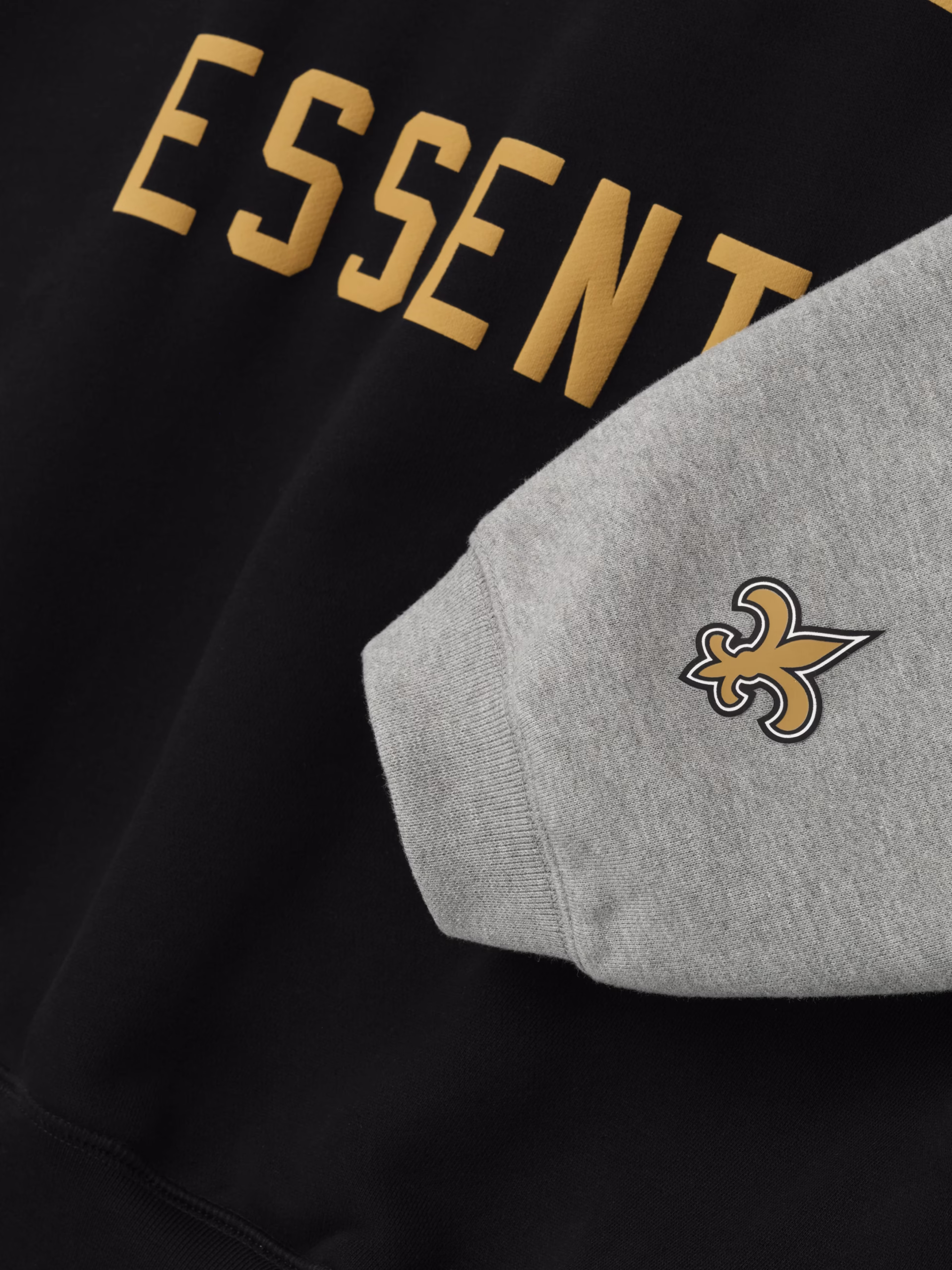 The Saints Sport Hoodie is crafted from heavy 480gsm core fleece and cut in a relaxed sport fit. The front features a bold "Saints Essentials" puff-print graphic paired with the official NFL shield logo. Additional features include, contrasting sleeves, side pockets, rib-knit at the cuffs and waist hem. The signature rubberized Fear of God Essentials label accents the hood.