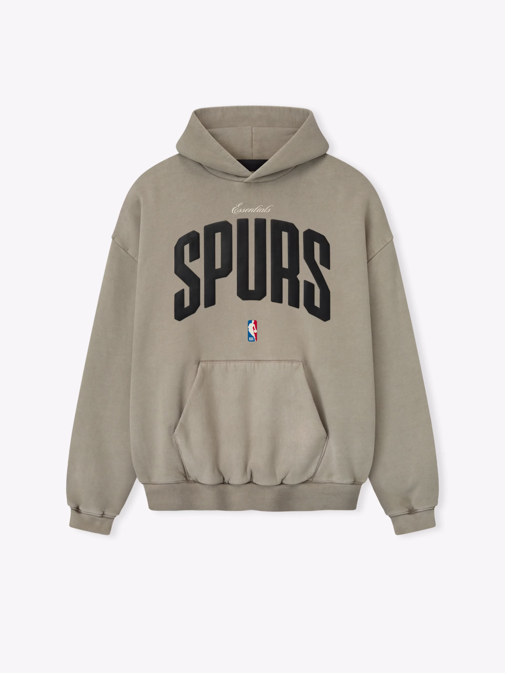 The Spurs 90s Hoodie is crafted from pigment-dyed, heavyweight 520GSM fleece and designed in a relaxed, 90s-inspired fit. The front features a bold puff-print “ESSENTIALS SPURS” graphic alongside the official NBA logo. Additional details include a kangaroo pocket, rib-knit cuffs and hem, and a signature rubberized Fear of God Essentials label accenting the hood.