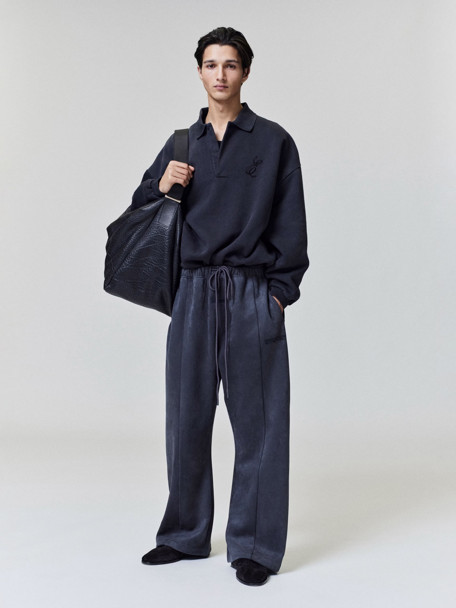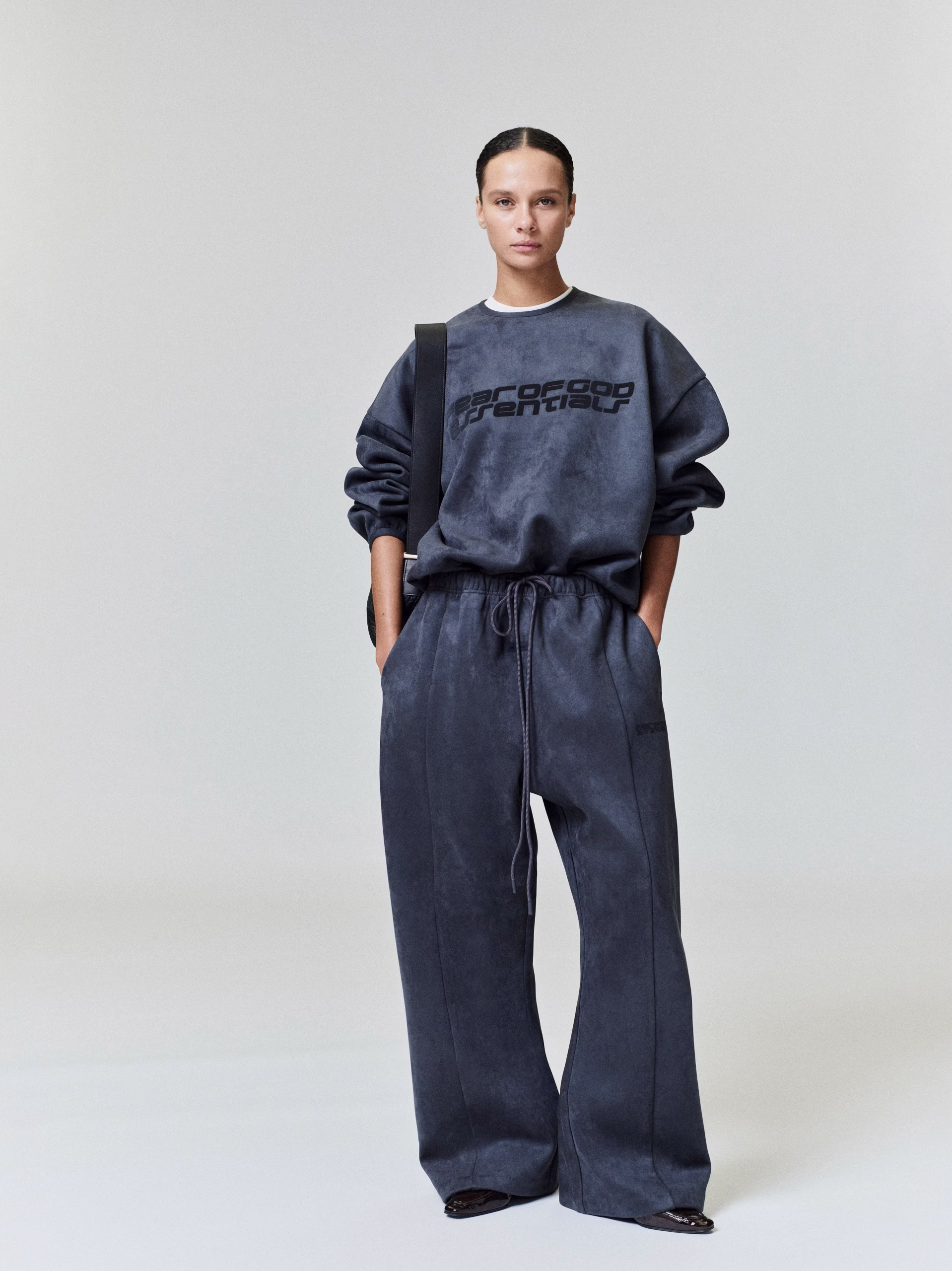 The Flare Sweatpant is crafted from bonded suede fleece, offering a plush, suede-like hand feel that complements its flared-leg silhouette. The leg is detailed with an HD-printed “Fear of God Essentials” lockup, while finishing touches include an encased elastic waistband with elongated drawcords, side seam pockets, and a Fear of God Essentials rubberized label stitched at the center front.