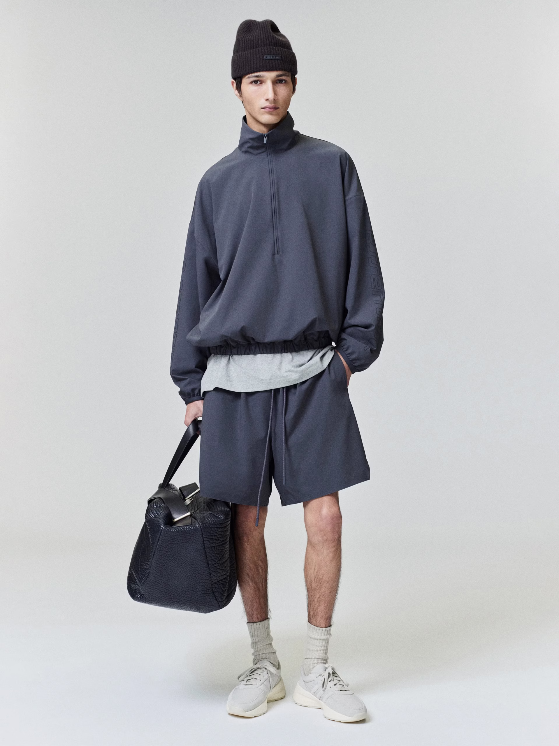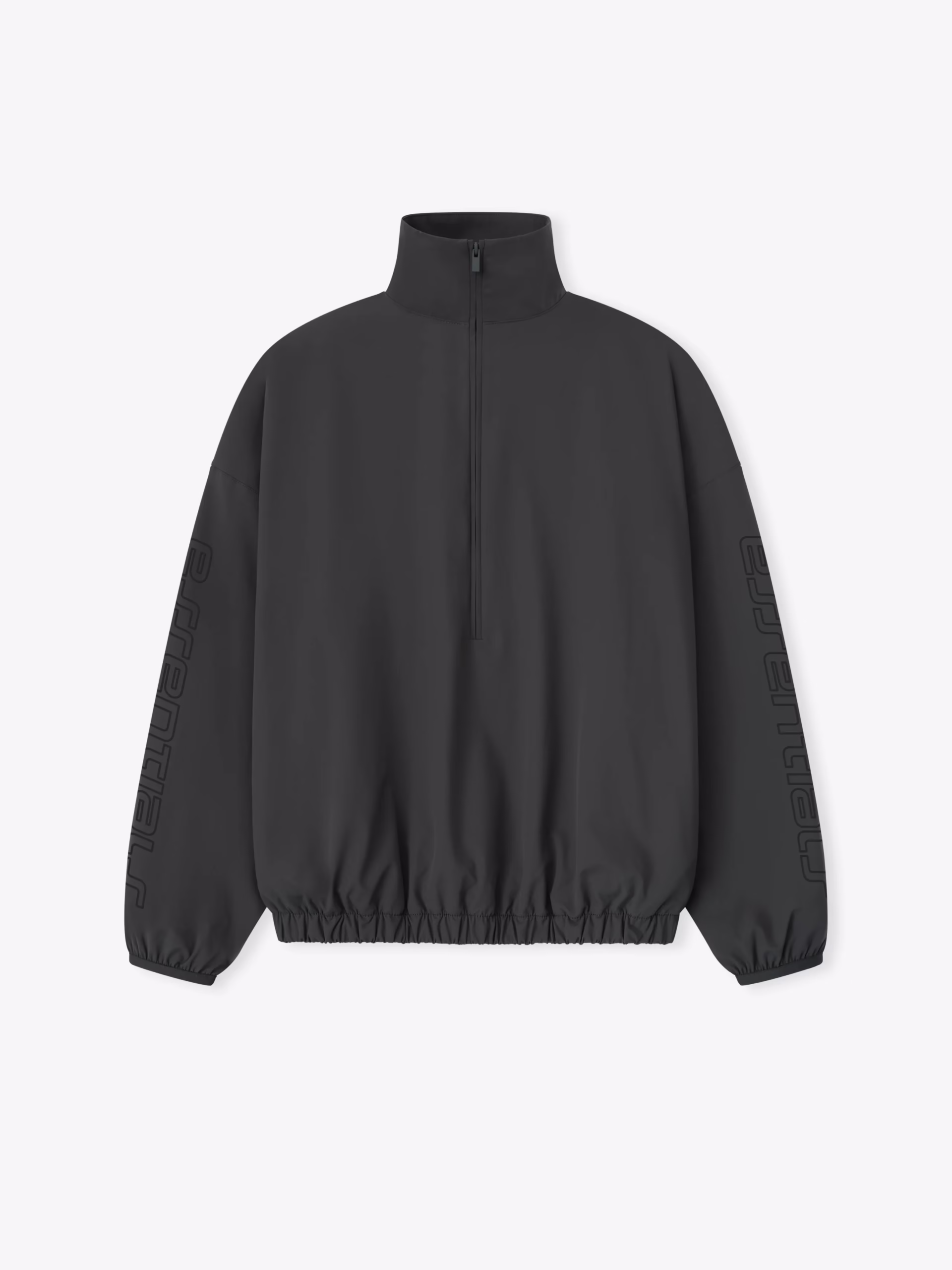 The Half Zip Track Jacket is crafted from tech nylon-spandex offering both stretch comfort and water repellant functionality. The piece is detailed with an metallic 3M-printed “Essentials ” graphic on the sleeves to enhance its relaxed, rounded silhouette. Additional details include a high neck, half-zip front, elasticized cuffs and waist hem. A Fear of God Essentials rubberized label stitched at the center front.