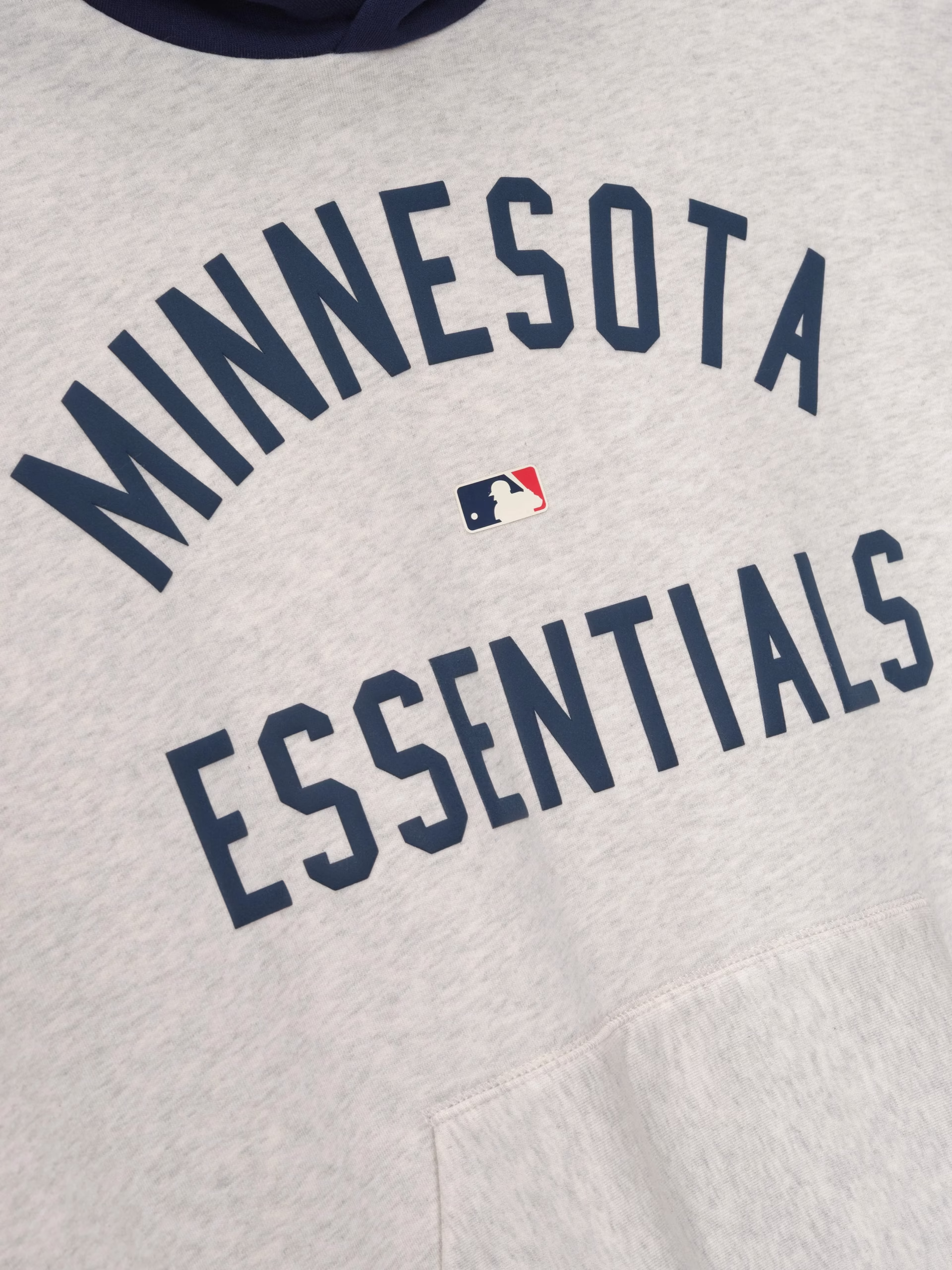 The Twins Sports Hoodie is crafted from core fleece, offering an elevated balance of softness, structure, and lasting comfort. Cut in a relaxed sport fit, it drapes with more ease through the body and extended length compared to the Essentials classic silhouette. The front features a bold puffer-print graphic reading "Minnesota Essentials" alongside the official MLB insignia, while the back is finished with the authentic Twins logo. Additional features include a contrasting hood, kangaroo pocket, elastic bindings at the cuffs and waist hem. The signature rubberized Fear of God Essentials label accents the hood.