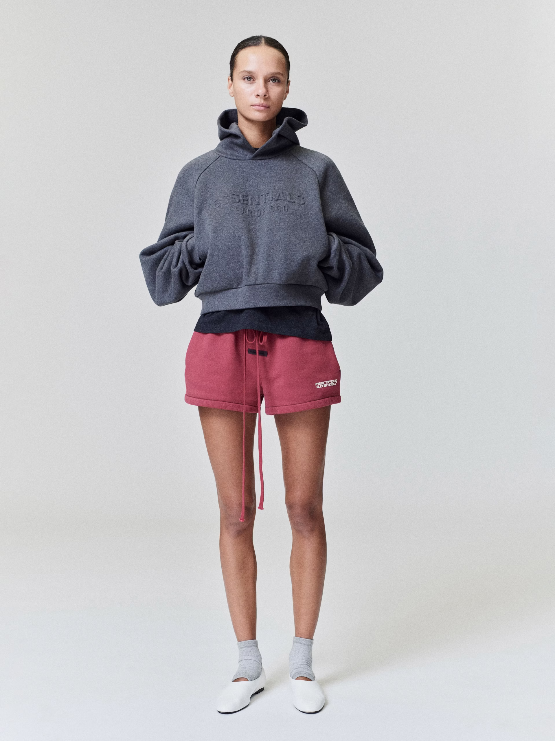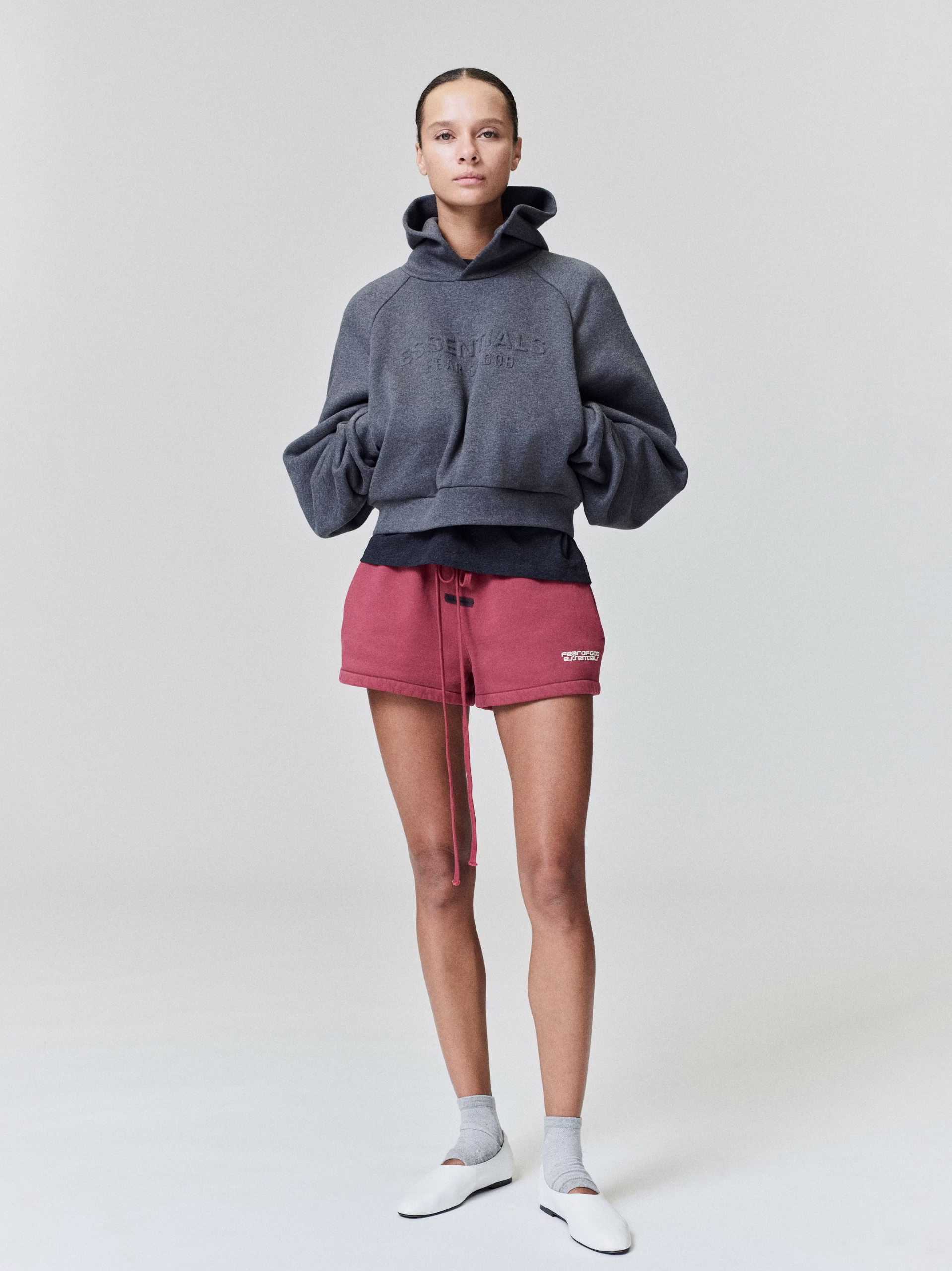 The Women's Relaxed Sweatshort is crafted from 520gsm heavy fleece and treated with a pigment dye to create rich depth of color. Its voluminous wide-leg silhouette is defined by a racing inspired “Fear of God Essentials” HD print graphic. Finishing details include encased elastic waistband with elongated drawcords, side seam pockets, and a Fear of God Essentials label stitched at the center front.